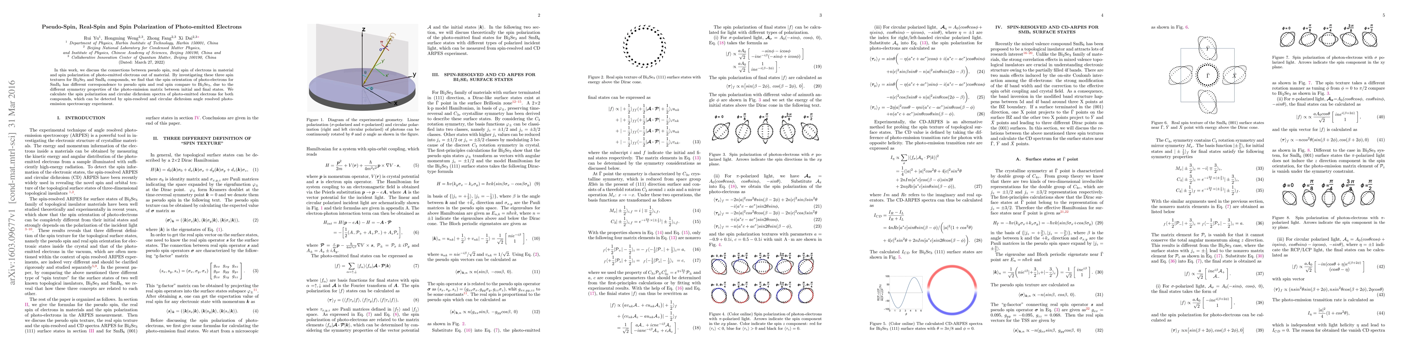 In this work, we discuss the connections between pseudo spin, real spin of electrons in material and spin polarization of photo-emitted electrons out of material. By investigating these three spin textures for Bi$_2$Se$_3$ and SmB$_6$ compounds, we find that the spin orientation of photo-electrons for SmB$_6$ has different correspondence to pseudo spin and real spin compare to Bi$_2$Se$_3$, due to the different symmetry properties of the photo-emission matrix between initial and final states. We calculate the spin polarization and circular dichroism spectra of photo-emitted electrons for both compounds, which can be detected by spin-resolved and circular dichroism angle resolved photo-emission spectroscopy experiment.