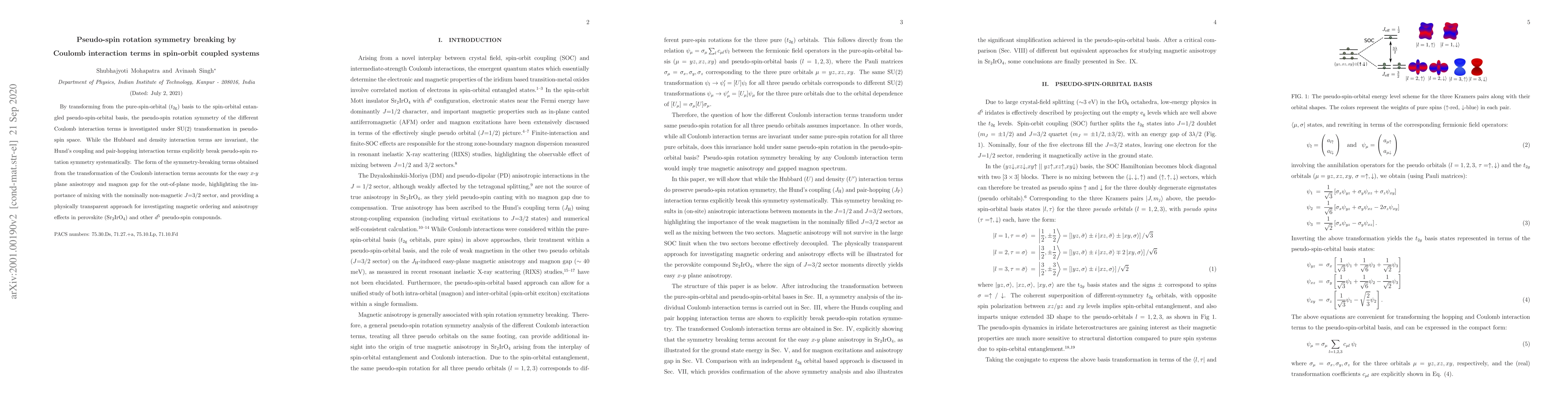 This paper investigates how Coulomb interaction terms in spin-orbit coupled systems break pseudo-spin rotation symmetry under SU(2) transformation. While Hubbard and density interaction terms remain invariant, Hund's coupling and pair-hopping terms systematically break this symmetry, providing insight into magnetic anisotropy and magnon gaps in perovskite materials like $\rm Sr_2 Ir O_4$.