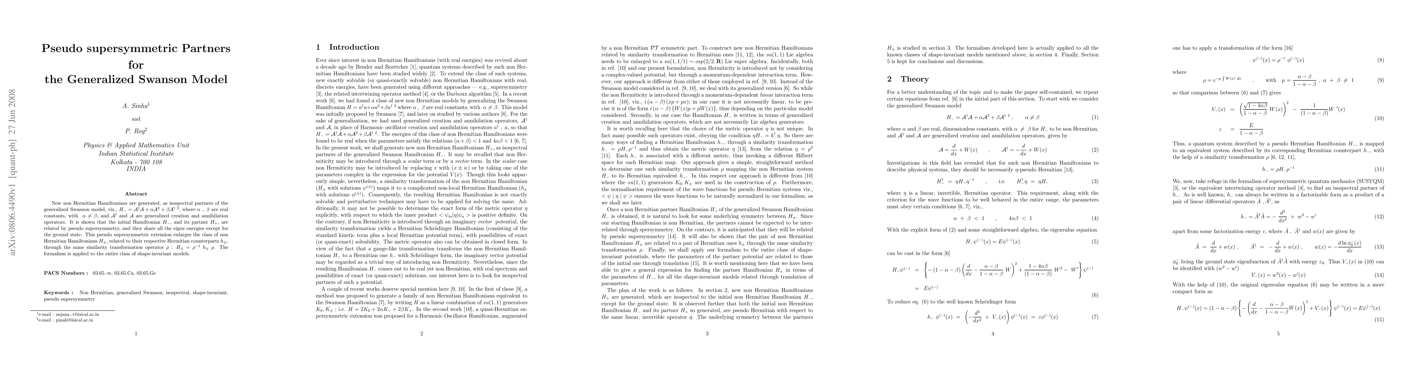 This paper introduces new non-Hermitian Hamiltonians, termed pseudo supersymmetric partners, for the generalized Swanson model, demonstrating their relationship via pseudo supersymmetry and showing that they share all eigen energies except for the ground state. The study extends to shape-invariant models through a similarity transformation linking them to their Hermitian counterparts.