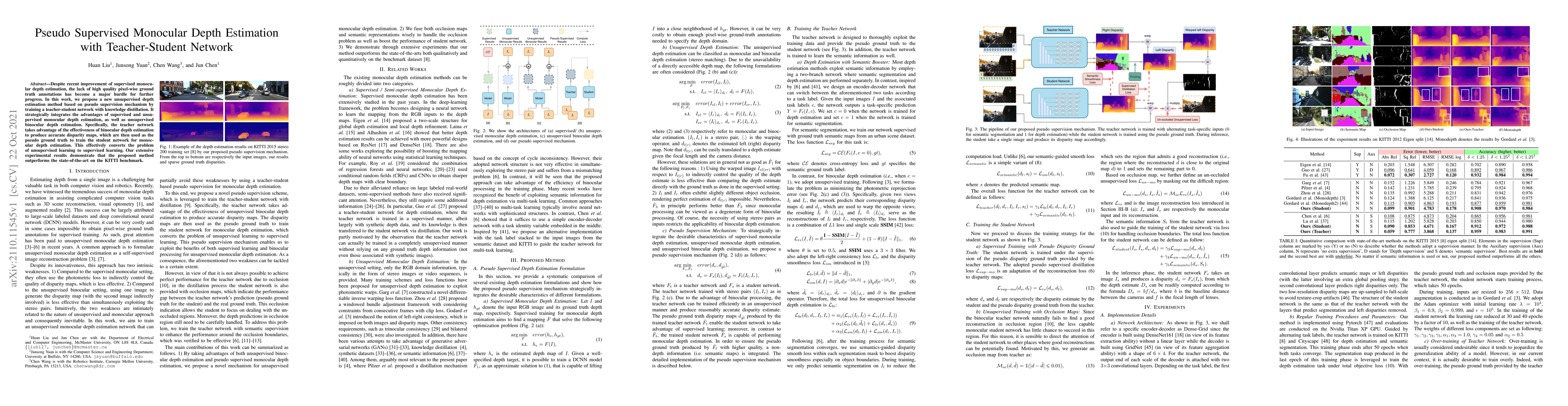 This paper proposes an unsupervised monocular depth estimation method using pseudo supervision through a teacher-student network with knowledge distillation. The teacher network leverages binocular depth estimation to generate accurate disparity maps, which serve as pseudo ground truth to train the student network, achieving superior performance compared to state-of-the-art methods on the KITTI benchmark.