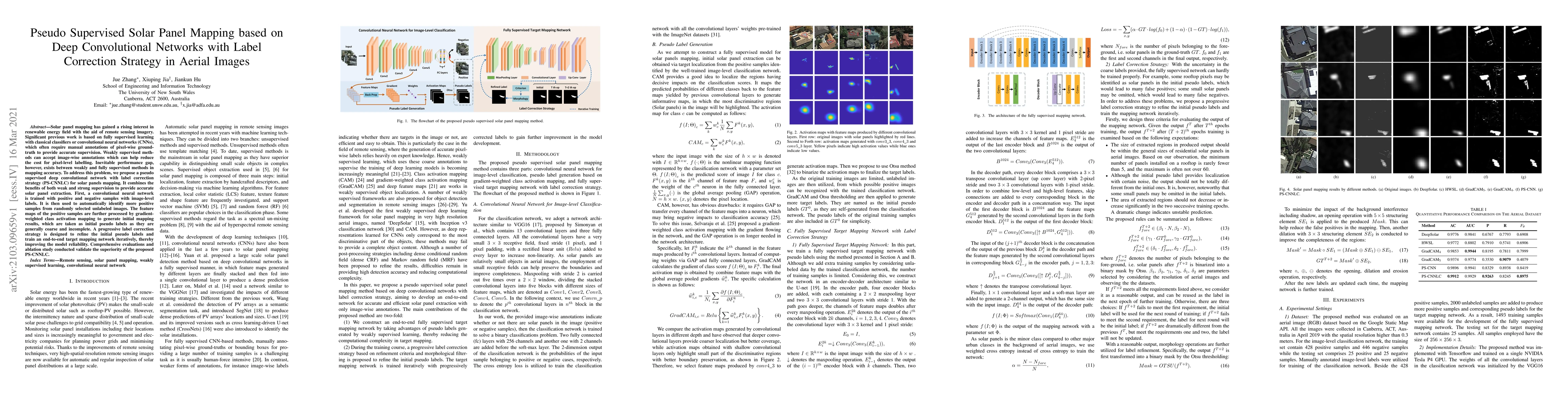 This paper proposes a pseudo supervised deep convolutional network with label correction strategy (PS-CNNLC) for solar panel mapping using aerial images. It combines weakly supervised learning with a label correction strategy to improve mapping accuracy, reducing the need for costly pixel-level annotations while achieving results comparable to fully supervised methods.