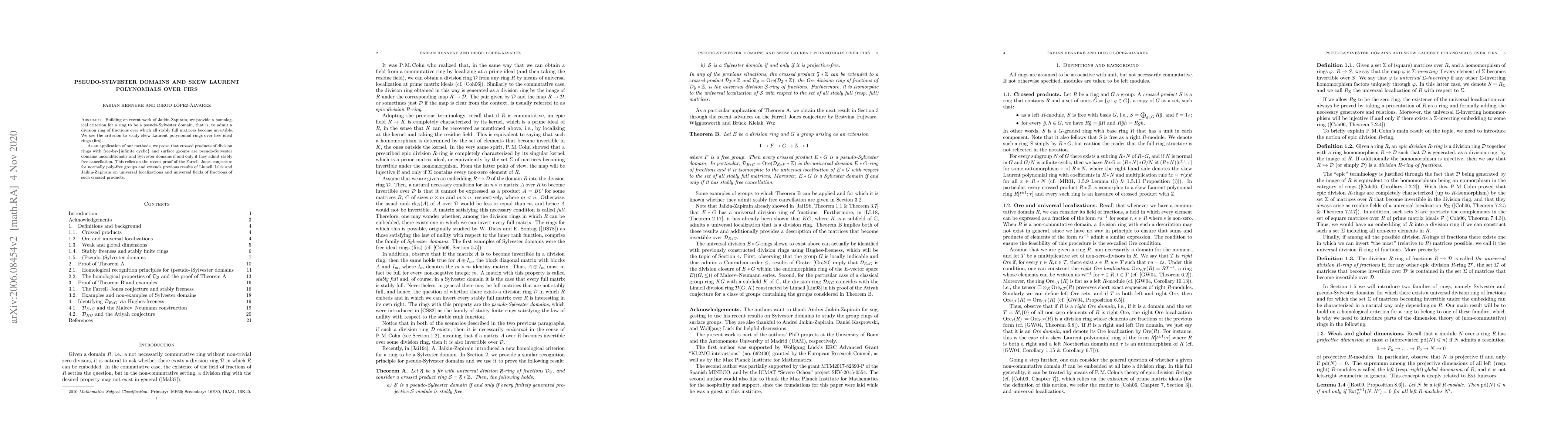 Building on recent work of Jaikin-Zapirain, we provide a homological criterion for a ring to be a pseudo-Sylvester domain, that is, to admit a division ring of fractions over which all stably full matrices become invertible. We use the criterion to study skew Laurent polynomial rings over free ideal rings (firs). As an application of our methods, we prove that crossed products of division rings with free-by-{infinite cyclic} and surface groups are pseudo-Sylvester domains unconditionally and Sylvester domains if and only if they admit stably free cancellation. This relies on the recent proof of the Farrell--Jones conjecture for normally poly-free groups and extends previous results of Linnell--L\"uck and Jaikin-Zapirain on universal localizations and universal fields of fractions of such crossed products.