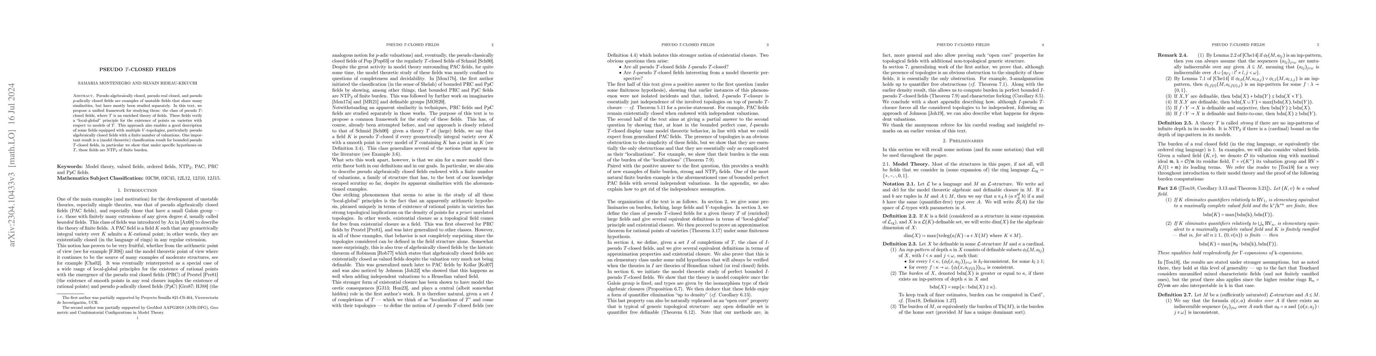 Pseudo algebraically closed, pseudo real closed, and pseudo $p$-adically closed fields are examples of unstable fields that share many similarities, but have mostly been studied separately. In this text, we propose a unified framework for studying them: the class of pseudo $T$-closed fields, where $T$ is an enriched theory of fields. These fields verify a "local-global" principle for the existence of points on varieties with respect to models of $T$. This approach also enables a good description of some fields equipped with multiple $V$-topologies, particularly pseudo algebraically closed fields with a finite number of valuations. One important result is a (model theoretic) classification result for bounded pseudo $T$-closed fields, in particular we show that under specific hypotheses on $T$, these fields are NTP$_2$ of finite burden.