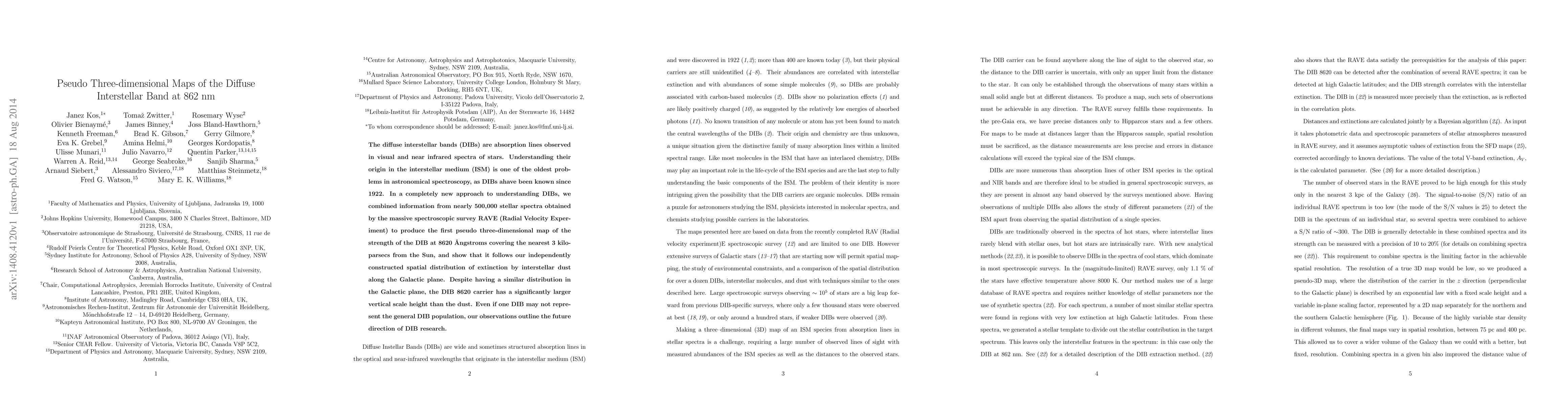 The diffuse interstellar bands (DIBs) are absorption lines observed in visual and near infrared spectra of stars. Understanding their origin in the interstellar medium (ISM) is one of the oldest problems in astronomical spectroscopy, as DIBs ahave been known since 1922. In a completely new approach to understanding DIBs, we combined information from nearly 500,000 stellar spectra obtained by the massive spectroscopic survey RAVE (Radial Velocity Experiment) to produce the first pseudo three-dimensional map of the strength of the DIB at 8620~{\AA}ngstroms covering the nearest 3 kiloparsecs from the Sun, and show that it follows our independently constructed spatial distribution of extinction by interstellar dust along the Galactic plane. Despite having a similar distribution in the Galactic plane, the DIB 8620 carrier has a significantly larger vertical scale height than the dust. Even if one DIB may not represent the general DIB population, our observations outline the future direction of DIB research.