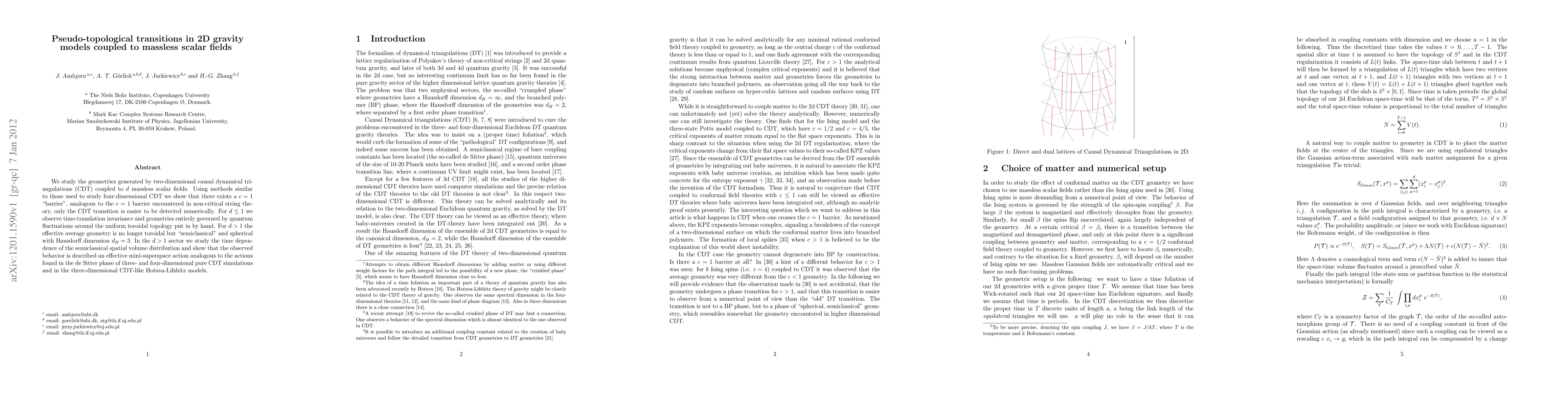 We study the geometries generated by two-dimensional causal dynamical triangulations (CDT) coupled to $d$ massless scalar fields. Using methods similar to those used to study four-dimensional CDT we show that there exists a $c=1$ "barrier", analogous to the $c=1$ barrier encountered in non-critical string theory, only the CDT transition is easier to be detected numerically. For $d\leq 1$ we observe time-translation invariance and geometries entirely governed by quantum fluctuations around the uniform toroidal topology put in by hand. For $d>1$ the effective average geometry is no longer toroidal but "semiclassical" and spherical with Hausdorff dimension $d_H = 3$. In the $d>1$ sector we study the time dependence of the semiclassical spatial volume distribution and show that the observed behavior is described an effective mini-superspace action analogous to the actions found in the de Sitter phase of three- and four-dimensional pure CDT simulations and in the three-dimensional CDT-like Ho\v{r}ava-Lifshitz models.