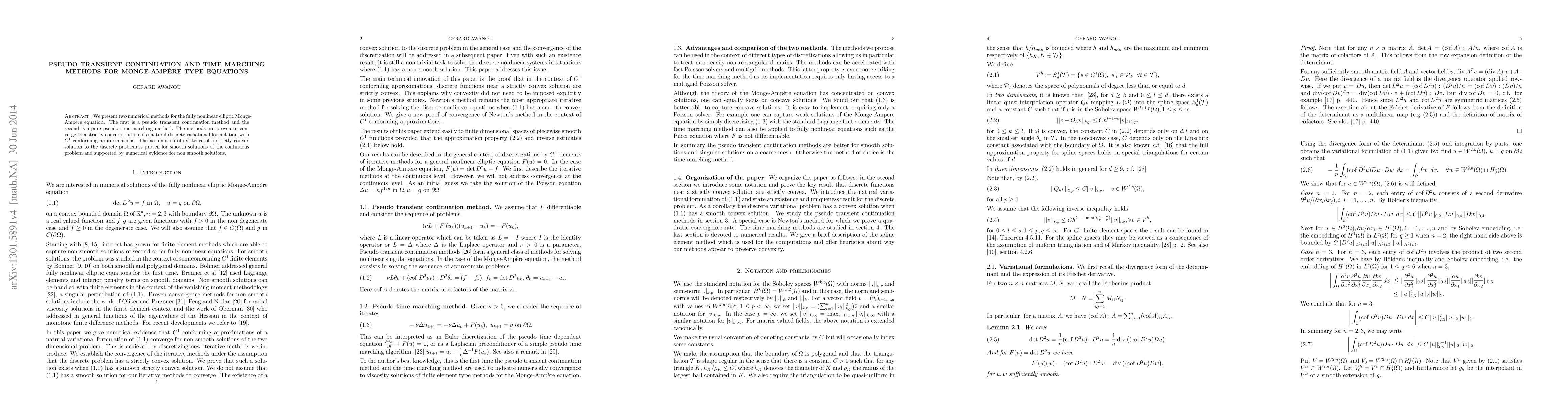 We present two numerical methods for the fully nonlinear elliptic Monge-Ampere equation. The first is a pseudo transient continuation method and the second is a pure pseudo time marching method. The methods are proven to converge to a strictly convex solution of a natural discrete variational formulation with $C^1$ conforming approximations. The assumption of existence of a strictly convex solution to the discrete problem is proven for smooth solutions of the continuous problem and supported by numerical evidence for non smooth solutions.
