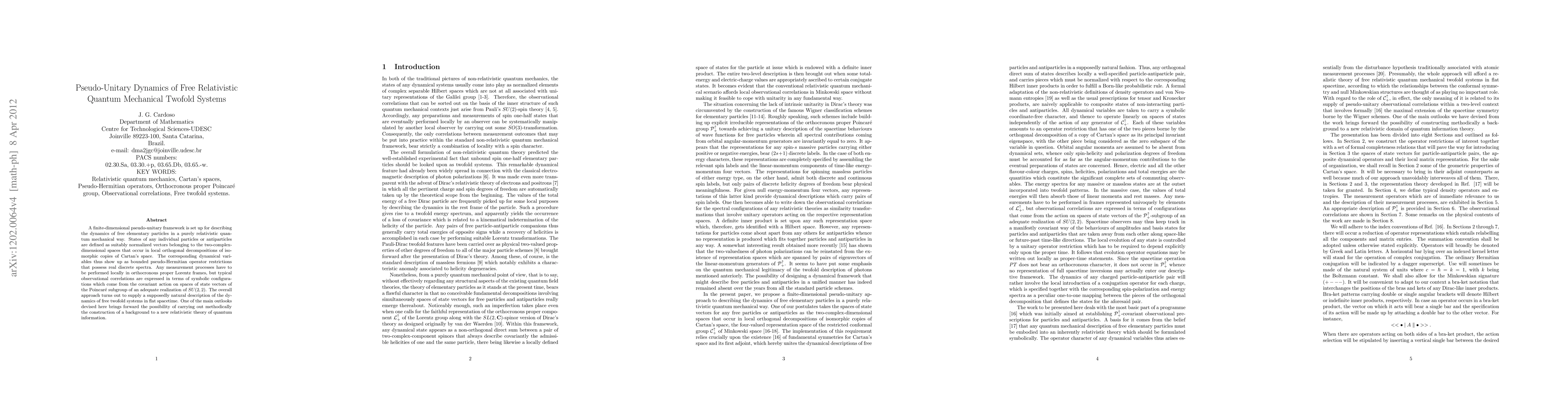A finite-dimensional pseudo-unitary framework is set up for describing the dynamics of free elementary particles in a purely relativistic quantum mechanical way. States of any individual particles or antiparticles are defined as suitably normalized vectors belonging to the two-complex-dimensional spaces that occur in local orthogonal decompositions of isomorphic copies of Cartan's space. The corresponding dynamical variables thus show up as bounded pseudo-Hermitian operator restrictions that possess real discrete spectra. Any measurement processes have to be performed locally in orthocronous proper Lorentz frames, but typical observational correlations are expressed in terms of symbolic configurations which come from the covariant action on spaces of state vectors of the Poincar\'e subgroup of an adequate realization of SU(2,2). The overall approach turns out to supply a supposedly natural description of the dynamics of free twofold systems in flat spacetime. One of the main outlooks devised here brings forward the possibility of carrying out methodically the construction of a background to a new relativistic theory of quantum information.