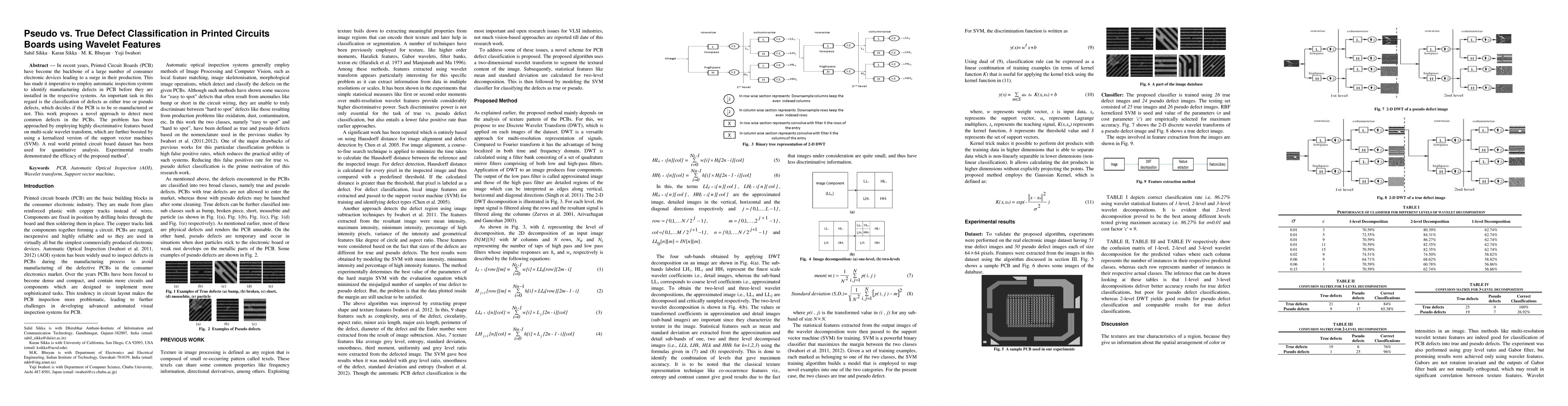 In recent years, Printed Circuit Boards (PCB) have become the backbone of a large number of consumer electronic devices leading to a surge in their production. This has made it imperative to employ automatic inspection systems to identify manufacturing defects in PCB before they are installed in the respective systems. An important task in this regard is the classification of defects as either true or pseudo defects, which decides if the PCB is to be re-manufactured or not. This work proposes a novel approach to detect most common defects in the PCBs. The problem has been approached by employing highly discriminative features based on multi-scale wavelet transform, which are further boosted by using a kernalized version of the support vector machines (SVM). A real world printed circuit board dataset has been used for quantitative analysis. Experimental results demonstrated the efficacy of the proposed method.