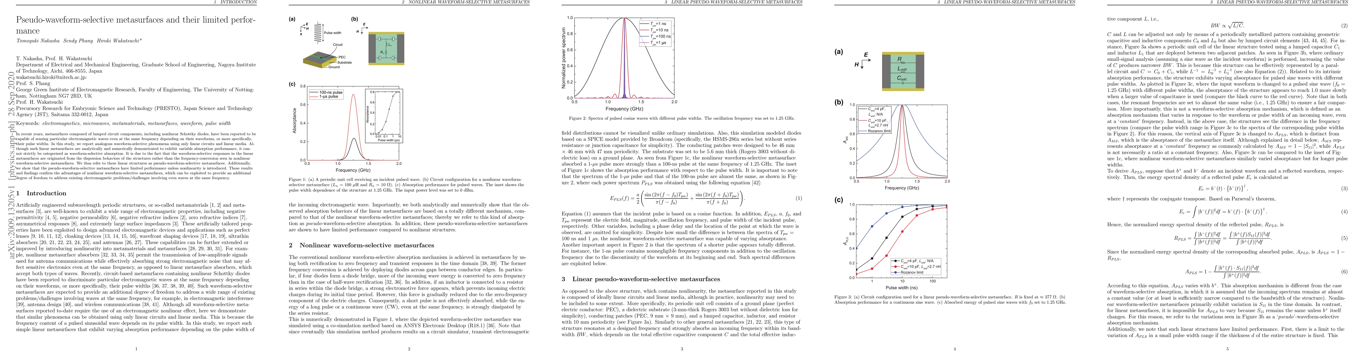 In recent years, metasurfaces composed of lumped circuit components, including nonlinear Schottky diodes, have been reported to be capable of sensing particular electromagnetic waves even at the same frequency depending on their waveforms, or more specifically, their pulse widths. In this study, we report analogous waveform-selective phenomena using only linear circuits and linear media. Although such linear metasurfaces are analytically and numerically demonstrated to exhibit variable absorption performance, it cannot strictly be categorized as waveform-selective absorption. It is due to the fact that the waveform-selective responses in the linear metasurfaces are originated from the dispersion behaviors of the structures rather than the frequency-conversion seen in nonlinear waveform-selective metasurfaces. We thus refer to these linear structures as pseudo-waveform-selective metasurfaces. Additionally, we show that the pseudo-waveform-selective metasurfaces have limited performance unless nonlinearity is introduced. These results and findings confirm the advantages of nonlinear waveform-selective metasurfaces, which can be exploited to provide an additional degree of freedom to address existing electromagnetic problems/challenges involving even waves at the same frequency.