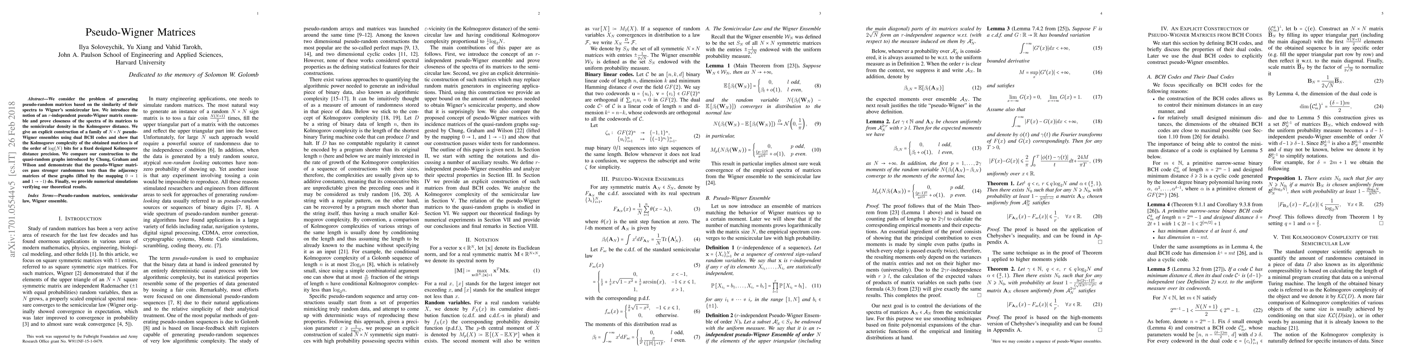 This paper introduces r-independent pseudo-Wigner matrices that mimic the spectral properties of Wigner matrices, proving their closeness to the semicircular law. An explicit construction using dual BCH codes is provided, demonstrating lower Kolmogorov complexity and stronger randomness tests compared to quasi-random graphs.