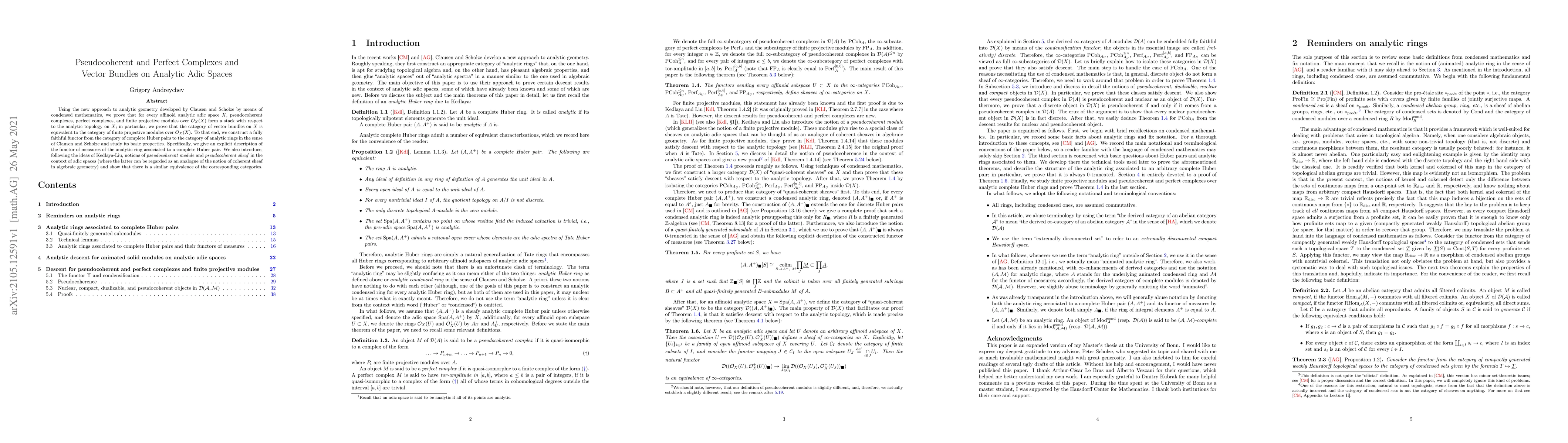 Using the new approach to analytic geometry developed by Clausen and Scholze by means of condensed mathematics, we prove that for every affinoid analytic adic space $X$, pseudocoherent complexes, perfect complexes, and finite projective modules over $\mathcal{O}_X(X)$ form a stack with respect to the analytic topology on $X$; in particular, we prove that the category of vector bundles on $X$ is equivalent to the category of finite projective modules over $\mathcal{O}_X(X)$. To that end, we construct a fully faithful functor from the category of complete Huber pairs to the category of analytic rings in the sense of Clausen and Scholze and study its basic properties. Specifically, we give an explicit description of the functor of measures of the analytic ring associated to a complete Huber pair. We also introduce, following the ideas of Kedlaya-Liu, notions of \textit{pseudocoherent module} and \textit{pseudocoherent sheaf} in the context of adic spaces (where the latter can be regarded as an analogue of the notion of coherent sheaf in algebraic geometry) and show that there is a similar equivalence of the corresponding categories.