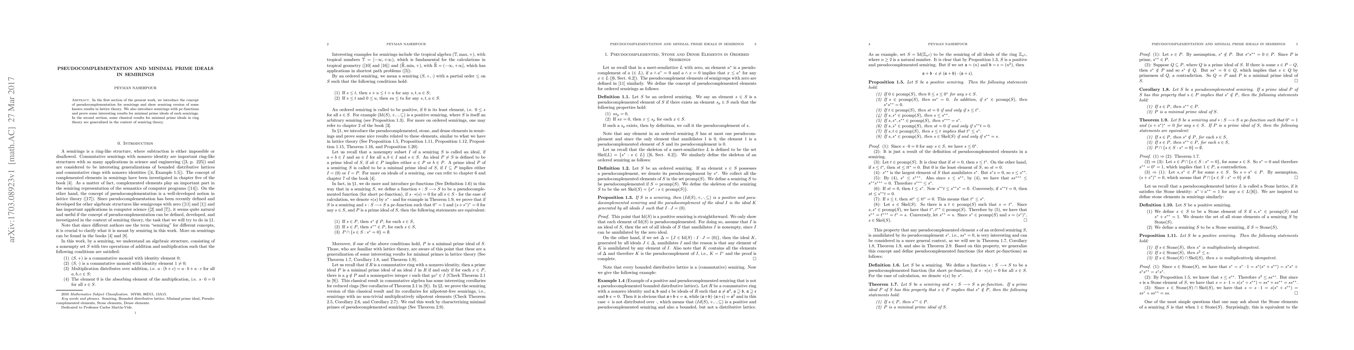 This paper introduces pseudocomplementation in semirings, extending lattice theory results to this algebraic structure. It also explores semirings with pc-functions and generalizes classical minimal prime ideal results from ring theory to semiring theory.