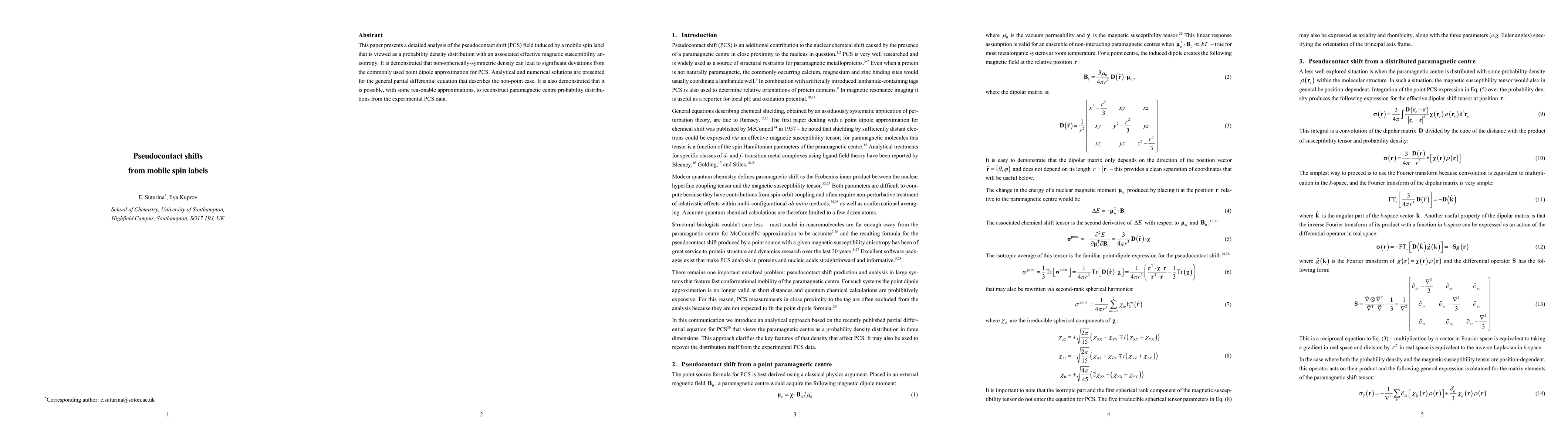 This paper presents a detailed analysis of the pseudocontact shift (PCS) field induced by a mobile spin label that is viewed as a probability density distribution with an associated effective magnetic susceptibility anisotropy. It is demonstrated that non-spherically-symmetric density can lead to significant deviations from the commonly used point dipole approximation for PCS. Analytical and numerical solutions are presented for the general partial differential equation that describes the non-point case. It is also demonstrated that it is possible, with some reasonable approximations, to reconstruct paramagnetic centre probability distributions from the experimental PCS data.
