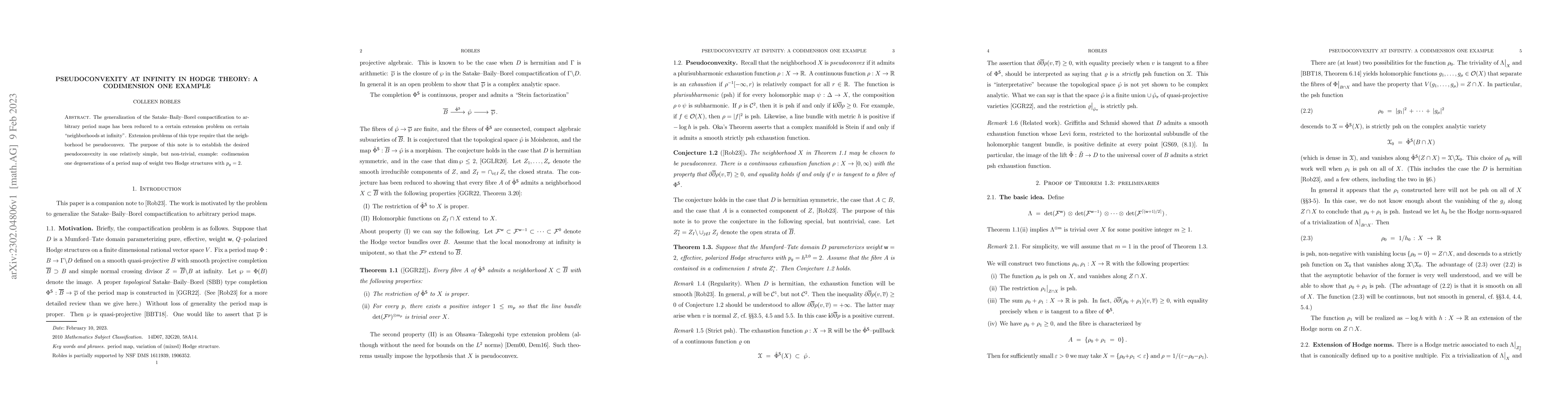 This paper establishes pseudoconvexity in codimension one degenerations of period maps for weight two Hodge structures with $h^{2,0} = 2$, addressing the extension problem crucial for the generalization of the Satake--Baily--Borel compactification. The result provides a non-trivial example of pseudoconvexity at infinity in Hodge theory.