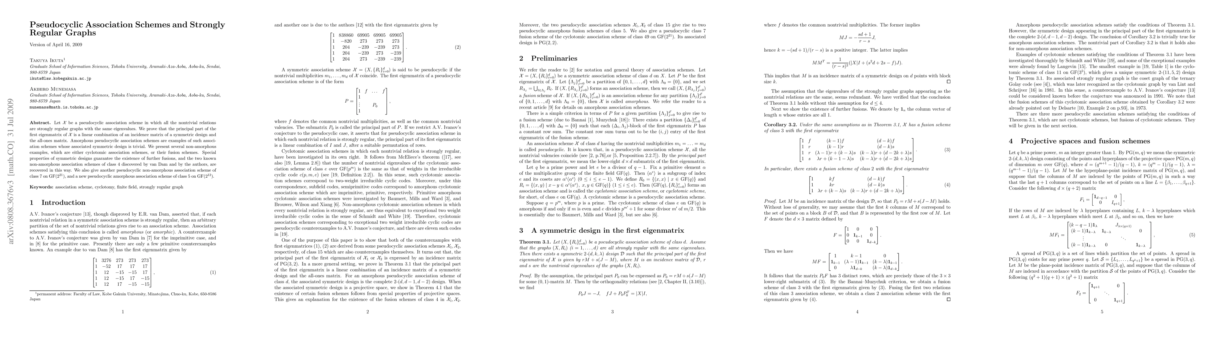 This paper proves that in pseudocyclic association schemes where all nontrivial relations are strongly regular graphs with identical eigenvalues, the principal part of the first eigenmatrix is a linear combination of a symmetric design's incidence matrix and the all-ones matrix. It also presents examples of non-amorphous schemes, including cyclotomic schemes and their fusions, and introduces a new pseudocyclic non-amorphous scheme of class 7.