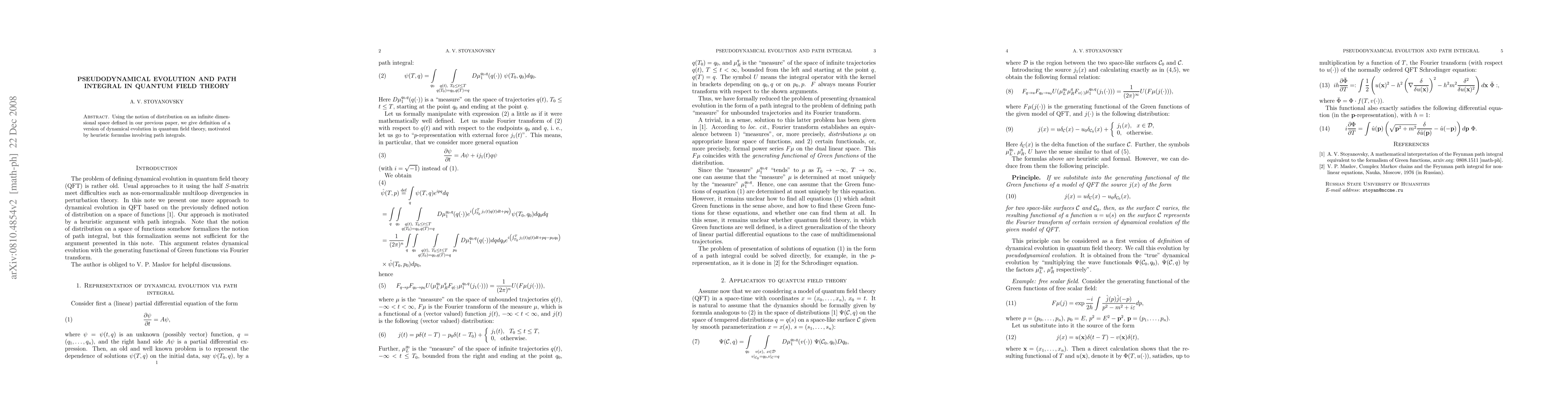 This paper introduces a pseudodynamical evolution framework in quantum field theory, leveraging distributions on infinite-dimensional spaces to define a version of dynamical evolution inspired by path integral heuristics. The approach aims to provide a new perspective on the evolution of quantum fields.