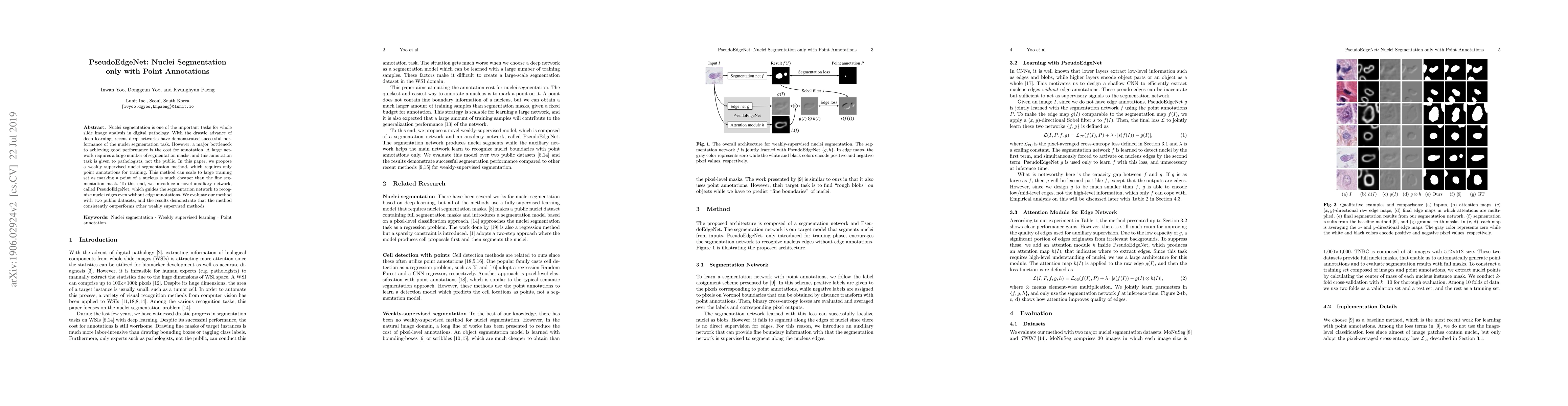 Title: PseudoEdgeNet: Nuclei Segmentation only with Point Annotations Summary: This paper proposes a weakly supervised method for nuclei segmentation in digital pathology that requires only point annotations instead of expensive segmentation masks. The introduced PseudoEdgeNet auxiliary network helps the segmentation network identify nuclei edges, achieving superior performance compared to other weakly supervised methods.