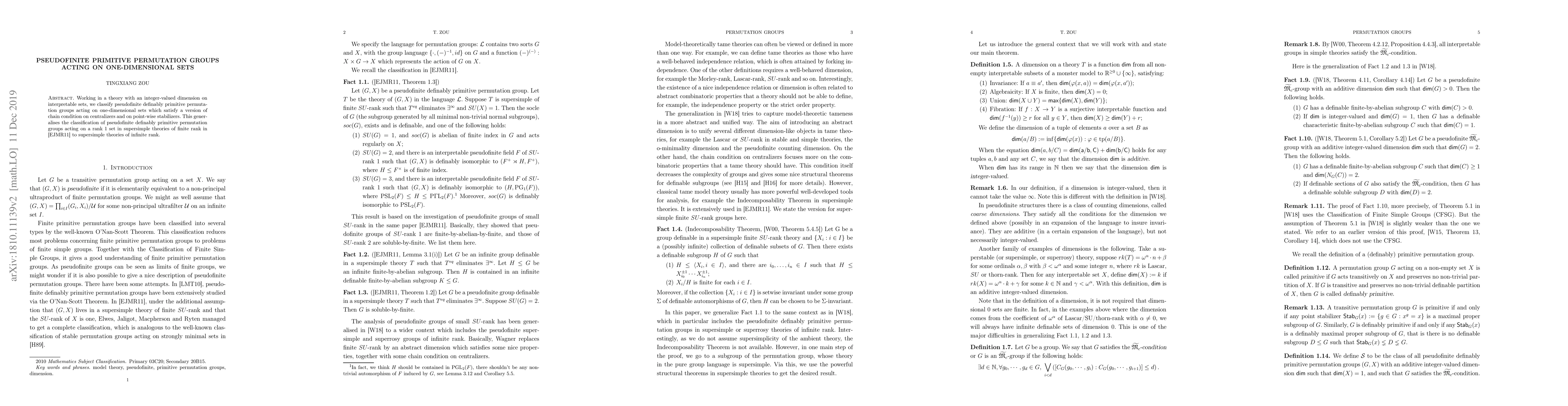 This paper classifies pseudofinite definably primitive permutation groups acting on one-dimensional sets in supersimple theories, generalizing the classification from finite to infinite rank. It focuses on groups satisfying a chain condition on centralizers and point-wise stabilizers.