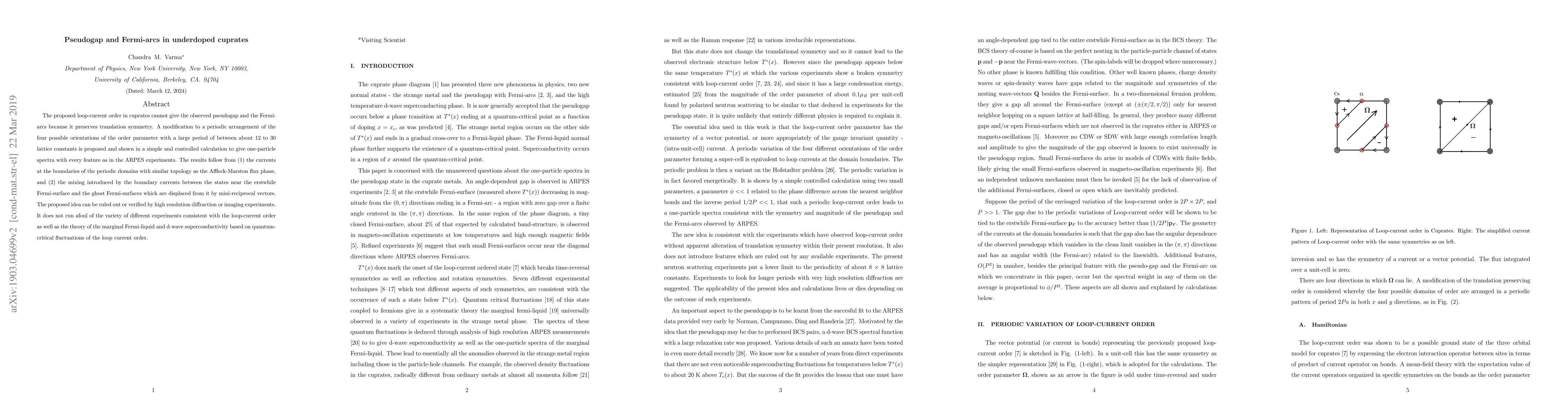 This paper proposes a modification to loop-current order to explain the pseudogap and Fermi-arcs in underdoped cuprates, suggesting periodic arrangements of the order parameter. The idea is supported by calculations matching ARPES experiments and can be tested via high-resolution diffraction or imaging.
