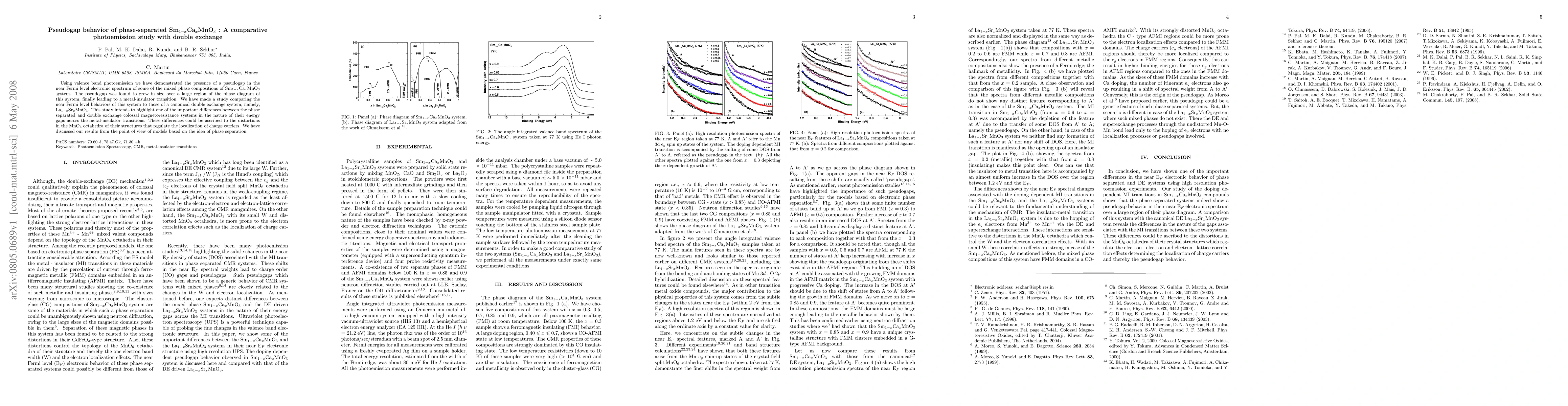 This study reveals a pseudogap in the electronic spectrum of phase-separated Sm$_{1-x}$Ca$_x$MnO$_3$ using photoemission, which grows and leads to a metal-insulator transition. Comparative analysis with La$_{1-x}$Sr$_x$MnO$_3$ highlights differences in energy gaps, suggesting structural distortions influence charge carrier localization.