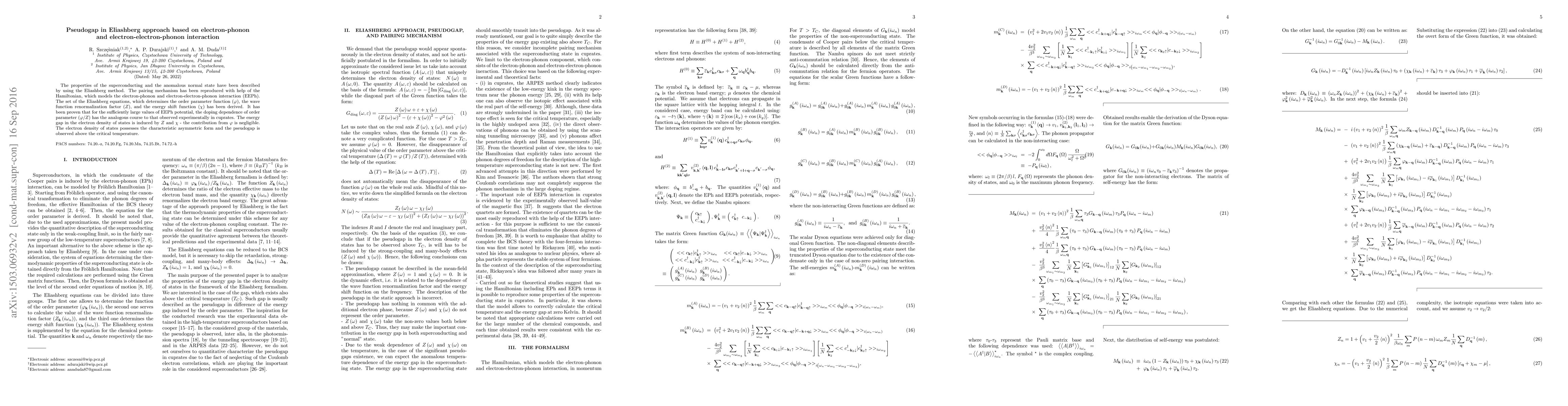 The properties of the superconducting and the anomalous normal state have been described by using the Eliashberg method. The pairing mechanism has been reproduced with help of the Hamiltonian, which models the electron-phonon and electron-electron-phonon interaction (EEPh). The set of the Eliashberg equations, which determines the order parameter function ($\varphi$), the wave function renormalization factor ($Z$), and the energy shift function ($\chi$) has been derived. It has been proven that for the sufficiently large values of EEPh potential, the doping dependence of order parameter ($\varphi/Z$) has the analogous course to that observed experimentally in cuprates. The energy gap in the electron density of states is induced by $Z$ and $\chi$ - the contribution from $\varphi$ is negligible. The electron density of states possesses the characteristic asymmetric form and the pseudogap is observed above the critical temperature.