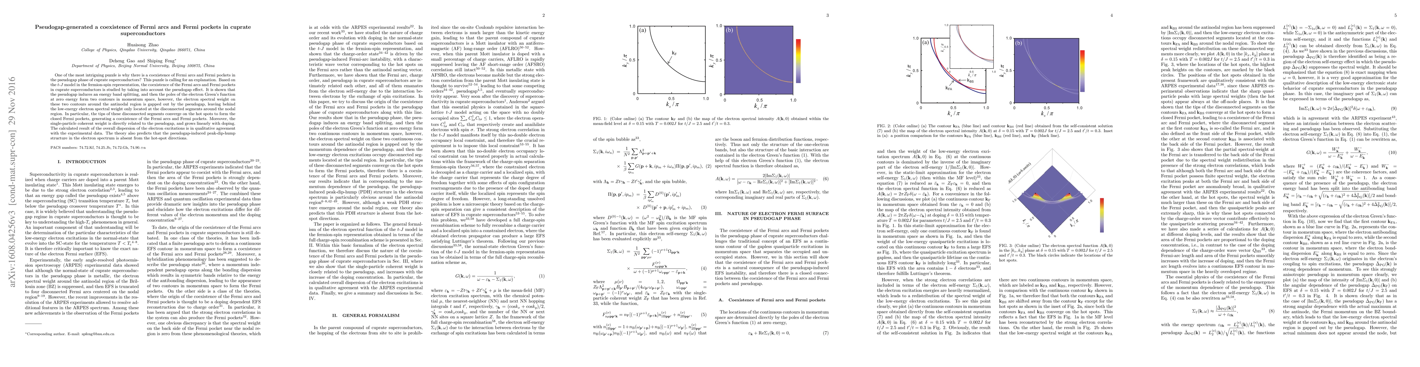 This study explains the coexistence of Fermi arcs and pockets in cuprate superconductors' pseudogap phase via the t-J model, showing pseudogap-induced energy band splitting and spectral weight redistribution, resulting in Fermi arcs near nodes and pockets at hotspots. The theory aligns with experimental data and predicts the absence of the peak-dip-hump structure in hot-spot directions.