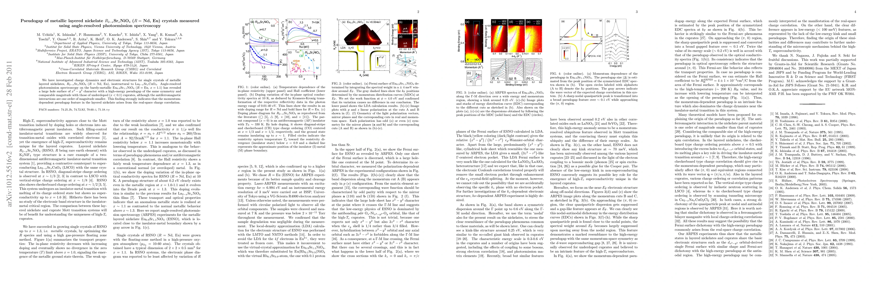 We have investigated charge dynamics and electronic structures for single crystals of metallic layered nickelates, R2-xSrxNiO4 (R=Nd, Eu), isostructural to La2-xSrxCuO4. Angle-resolved photoemission spectroscopy on the barely-metallic Eu0.9Sr1.1NiO4 (R=Eu, x=1.1) has revealed a large hole surface of x2-y2 character with a high-energy pseudogap of the same symmetry and comparable magnitude with those of underdoped (x<0.1) cuprates, although the antiferromagnetic interactions are one order of magnitude smaller. This finding strongly indicates that the momentum-dependent pseudogap feature in the layered nickelate arises from the real-space charge correlation.