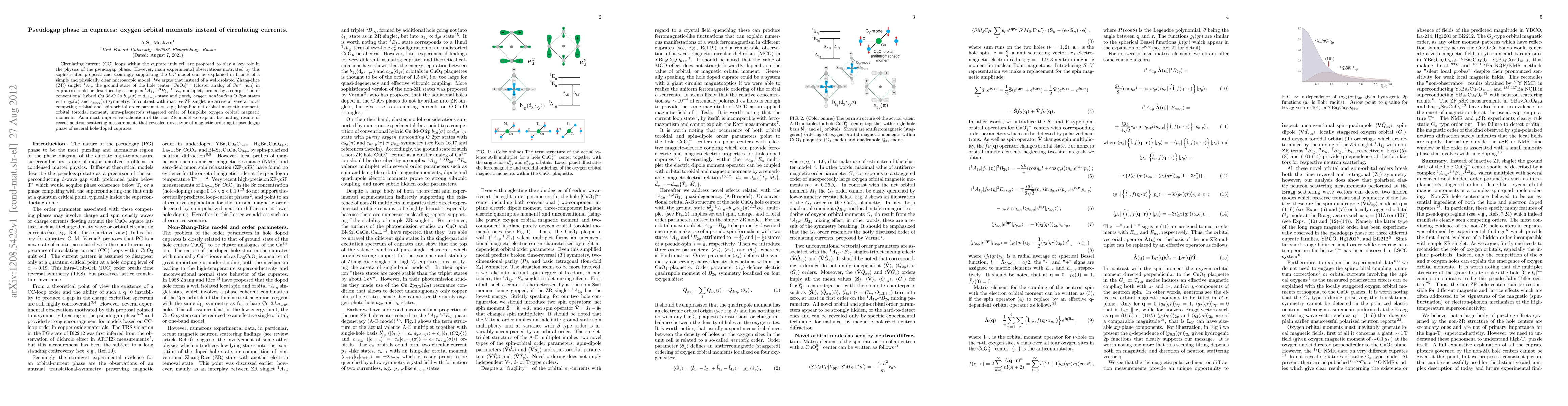 Circulating current (CC) loops within the cuprate unit cell are proposed to play a key role in the physics of the pseudogap phase. However, main experimental observations motivated by this sophisticated proposal and seemingly supporting the CC model can be explained in frames of a simple and physically clear microscopic model. We argue that instead of a well-isolated Zhang-Rice (ZR) singlet $^1A_{1g}$ the ground state of the hole center [CuO$_4$]$^{5-}$ (cluster analog of Cu$^{3+}$ ion) in cuprates should be described by a complex $^1A_{1g}$-$^{1,3}B_{2g}$-$^{1,3}E_u$ multiplet, formed by a competition of conventional hybrid Cu 3d-O 2p $b_{1g}(\sigma)\propto d_{x^2 -y^2}$ state and {\it purely oxygen nonbonding} O 2p$\pi$ states with $a_{2g}(\pi)$ and $e_{ux,y}(\pi)$ symmetry. In contrast with inactive ZR singlet we arrive at several novel competing orbital and spin-orbital order parameters, e.g., Ising-like net orbital magnetic moment, orbital toroidal moment, intra-plaquette's staggered order of Ising-like oxygen orbital magnetic moments. As a most impressive validation of the non-ZR model we explain fascinating results of recent neutron scattering measurements that revealed novel type of magnetic ordering in pseudogap phase of several hole-doped cuprates.
