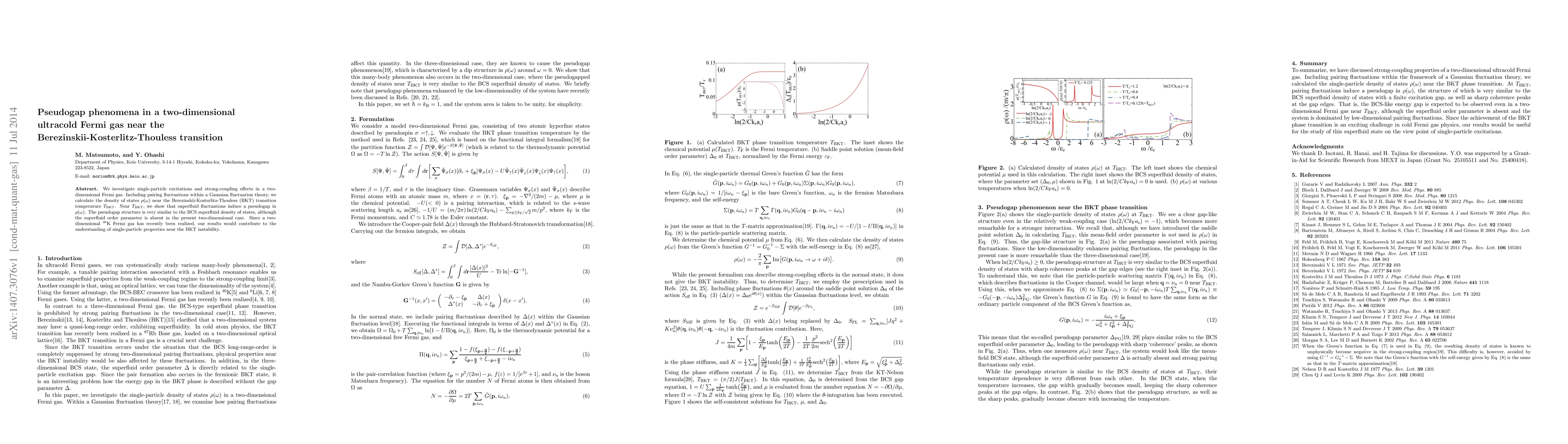 This paper explores the pseudogap phenomena in a two-dimensional ultracold Fermi gas near the Berezinskii-Kosterlitz-Thouless transition, revealing that superfluid fluctuations induce a pseudogap in the density of states similar to BCS superfluid states, despite the absence of a conventional order parameter in two dimensions. The findings are relevant for understanding single-particle properties in recently realized two-dimensional $^{40}$K Fermi gases.