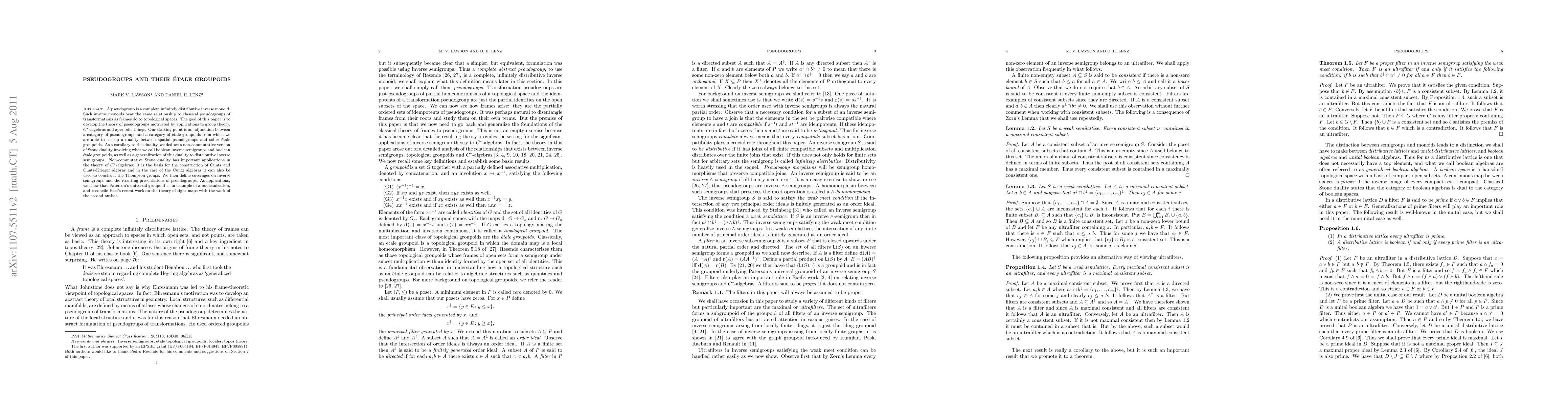 A pseudogroup is a complete infinitely distributive inverse monoid. Such inverse monoids bear the same relationship to classical pseudogroups of transformations as frames do to topological spaces. The goal of this paper is to develop the theory of pseudogroups motivated by applications to group theory, C*-algebras and aperiodic tilings. Our starting point is an adjunction between a category of pseudogroups and a category of etale groupoids from which we are able to set up a duality between spatial pseudogroups and sober etale groupoids. As a corollary to this duality, we deduce a non-commutative version of Stone duality involving what we call boolean inverse semigroups and boolean etale groupoids, as well as a generalization of this duality to distributive inverse semigroups. Non-commutative Stone duality has important applications in the theory of C*-algebras: it is the basis for the construction of Cuntz and Cuntz-Krieger algbras and in the case of the Cuntz algebras it can also be used to construct the Thompson groups. We then define coverages on inverse semigroups and the resulting presentations of pseudogroups. As applications, we show that Paterson's universal groupoid is an example of a booleanization, and reconcile Exel's recent work on the theory of tight maps with the work of the second author.
