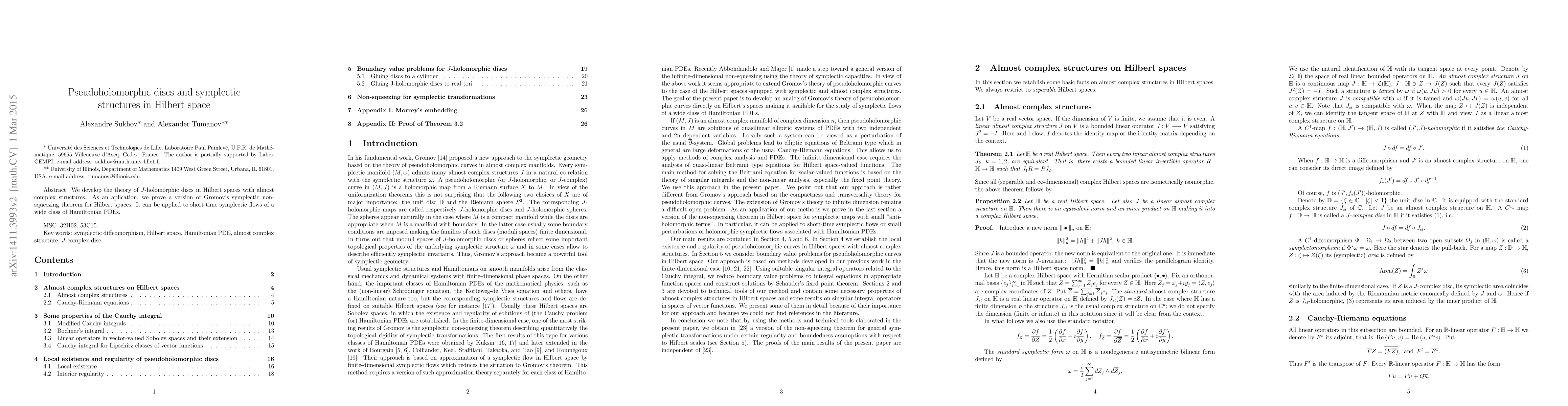 We develop the theory of $J$-holomorphic discs in Hilbert spaces with almost complex structures. As an aplication, we prove a version of Gromov's symplectic non-squeezing theorem for Hilbert spaces. It can be applied to short-time symplectic flows of a wide class of Hamiltonian PDEs.