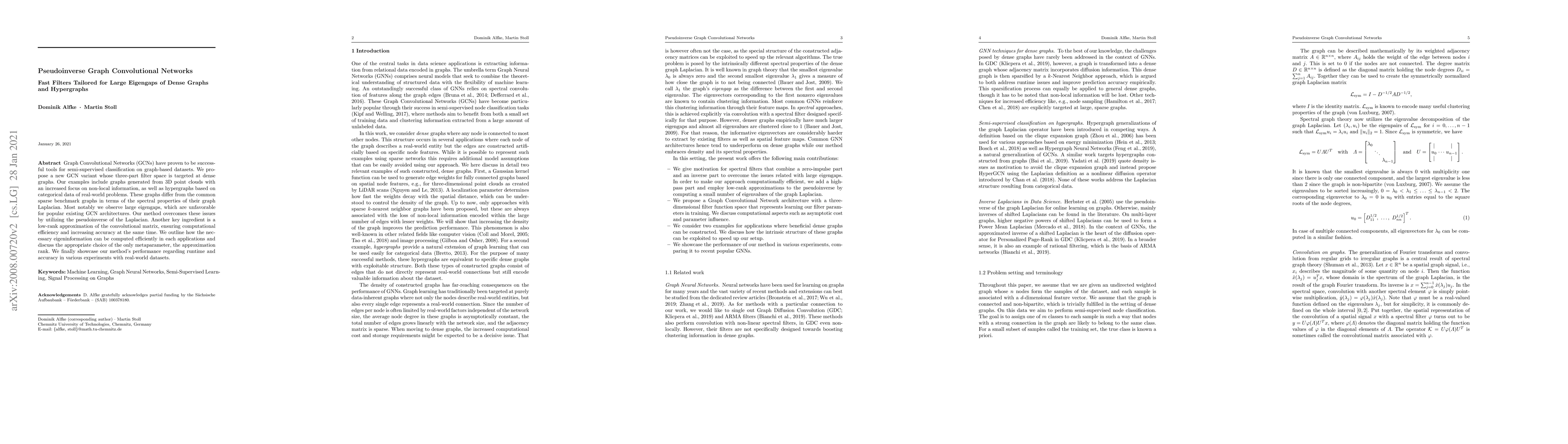 This paper proposes a new Pseudoinverse Graph Convolutional Network (PGCN) variant tailored for dense graphs and hypergraphs, addressing large eigengaps in their Laplacians. The method leverages the pseudoinverse of the Laplacian and low-rank approximations to enhance computational efficiency and accuracy, demonstrating improved performance in experiments on real-world datasets.