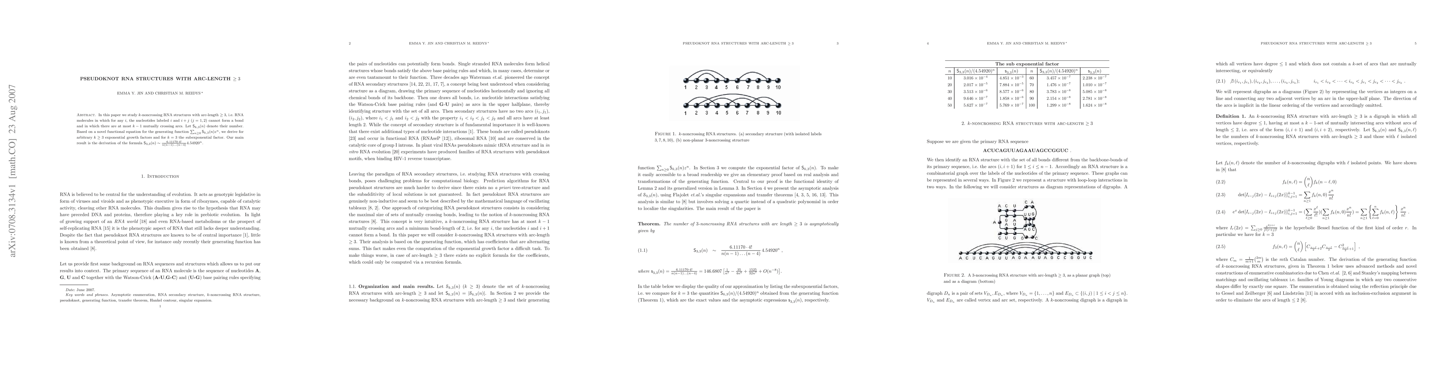 In this paper we study $k$-noncrossing RNA structures with arc-length $\ge 3$, i.e. RNA molecules in which for any $i$, the nucleotides labeled $i$ and $i+j$ ($j=1,2$) cannot form a bond and in which there are at most $k-1$ mutually crossing arcs. Let ${\sf S}_{k,3}(n)$ denote their number. Based on a novel functional equation for the generating function $\sum_{n\ge 0}{\sf S}_{k,3}(n)z^n$, we derive for arbitrary $k\ge 3$ exponential growth factors and for $k=3$ the subexponential factor. Our main result is the derivation of the formula ${\sf S}_{3,3}(n) \sim \frac{6.11170\cdot 4!}{n(n-1)...(n-4)} 4.54920^n$.