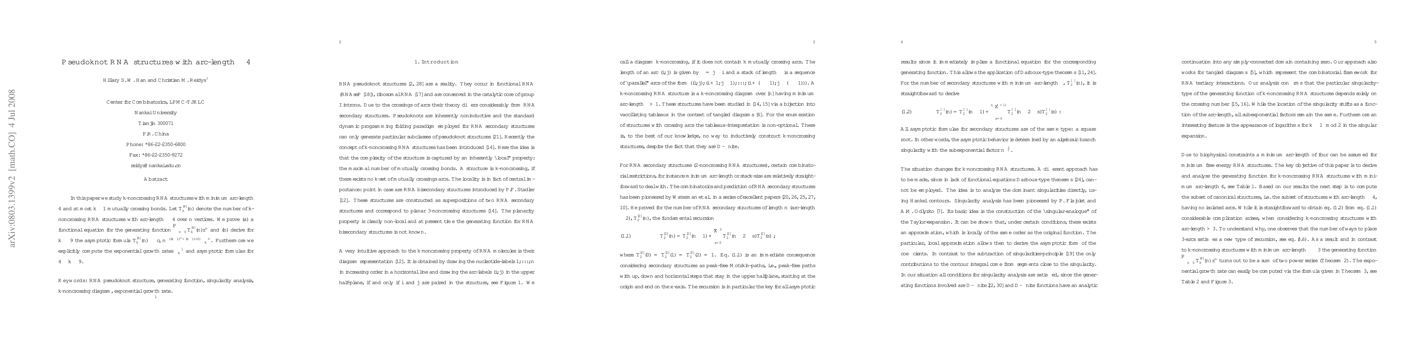 In this paper we study $k$-noncrossing RNA structures with minimum arc-length 4 and at most $k-1$ mutually crossing bonds. Let ${\sf T}_{k}^{[4]}(n)$ denote the number of $k$-noncrossing RNA structures with arc-length $\ge 4$ over $n$ vertices. We prove (a) a functional equation for the generating function $\sum_{n\ge 0}{\sf T}_{k}^{[4]}(n)z^n$ and (b) derive for $k\le 9$ the asymptotic formula ${\sf T}_{k}^{[4]}(n)\sim c_k n^{-((k-1)^2+(k-1)/2)} \gamma_k^{-n}$. Furthermore we explicitly compute the exponential growth rates $\gamma_k^{-1}$ and asymptotic formulas for $4\le k\le 9$.