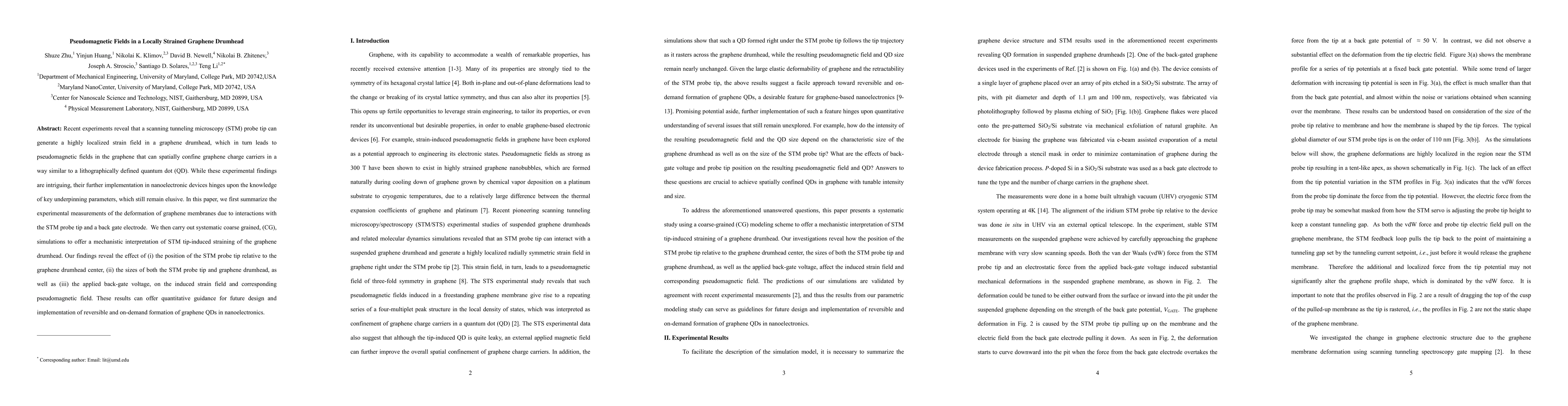 This paper investigates how a scanning tunneling microscopy (STM) probe tip induces strain fields in graphene drumheads, leading to pseudomagnetic fields that confine charge carriers. Through experimental measurements and coarse-grained simulations, the authors identify key parameters affecting the strain and pseudomagnetic field, including tip position, tip and drumhead sizes, and back-gate voltage, providing insights for future graphene quantum dot design in nanoelectronics.