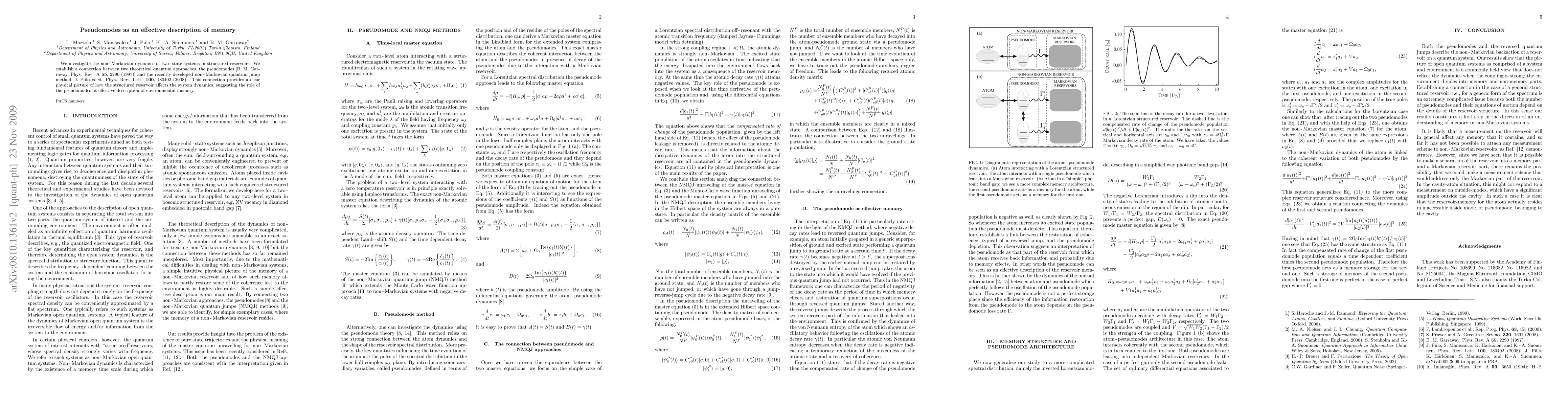 This paper explores the non-Markovian dynamics of two-state systems influenced by structured reservoirs, establishing a link between pseudomodes and the non-Markovian quantum jump method to illustrate how the environment's memory affects the system's dynamics. The pseudomodes are shown to provide an effective description of this environmental memory.