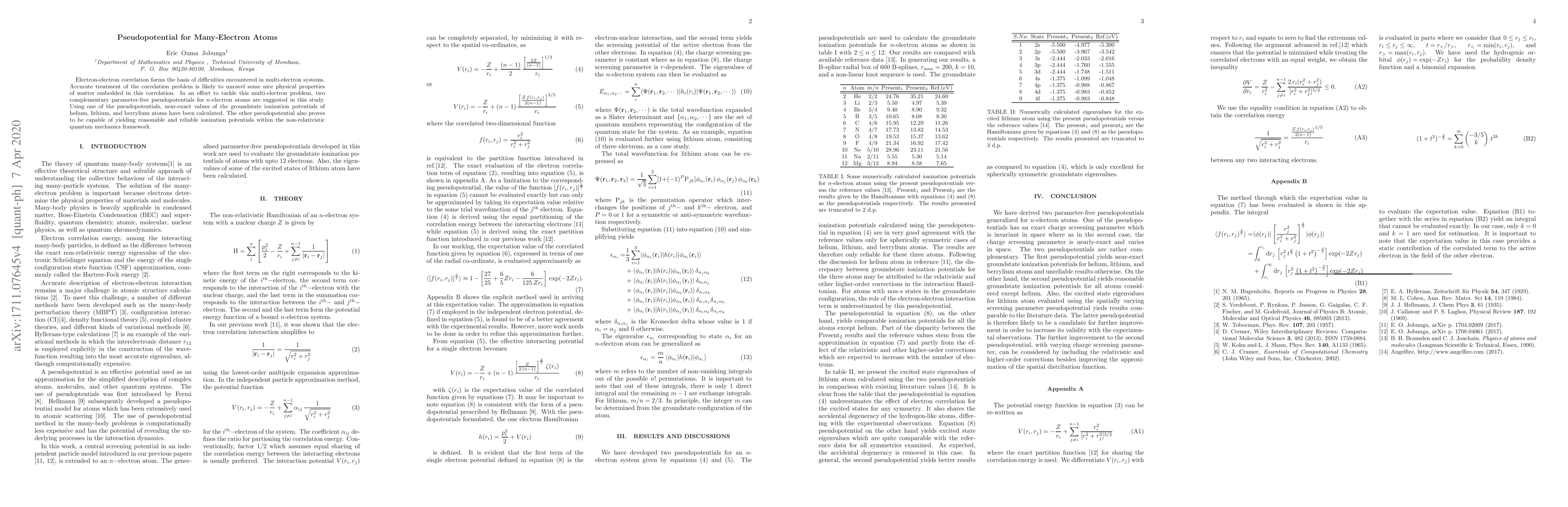 Electron-electron correlation forms the basis of difficulties encountered in multi-electron systems. Accurate treatment of the correlation problem is likely to unravel some nice physical properties of matter embedded in this correlation. In an effort to tackle this multi-electron problem, two complementary parameter-free pseudopotentials for $n$-electron atoms are suggested in this study. Using one of the pseudopotentials, near-exact values of the groundstate ionization potentials of helium, lithium, and berrylium atoms have been calculated. The other pseudopotential also proves to be capable of yielding reasonable and reliable ionization potentials within the non-relativistic quantum mechanics framework.