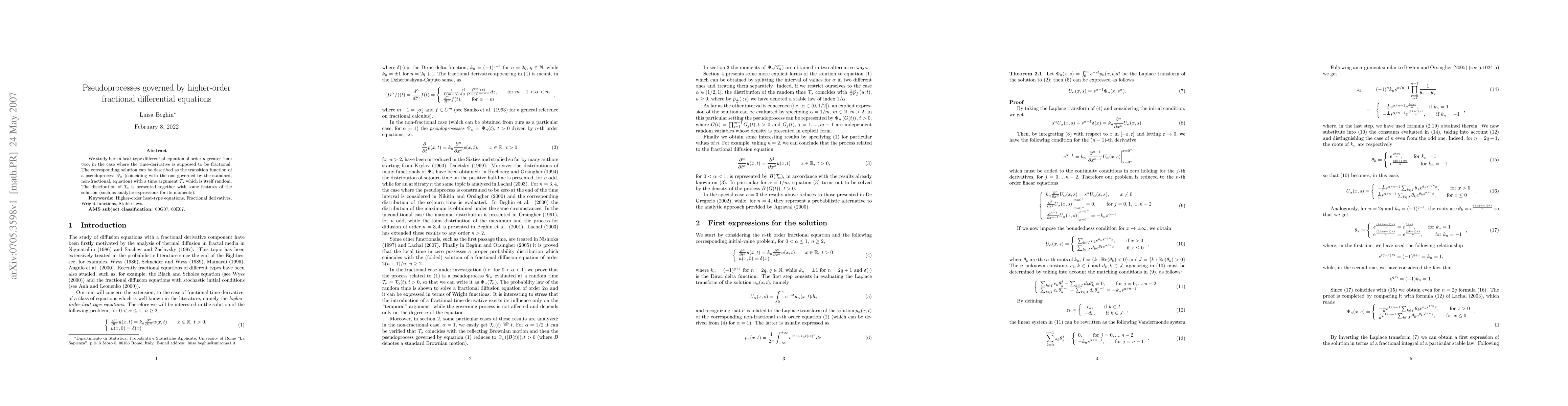 We study here a heat-type differential equation of order n greater than two, in the case where the time-derivative is supposed to be fractional. The corresponding solution can be described as the transition function of a pseudoprocess (coinciding with the one governed by the standard, non-fractional, equation) with a time argument T which is itself random. The distribution of T is presented together with some features of the solution (such as analytic expressions for its moments).