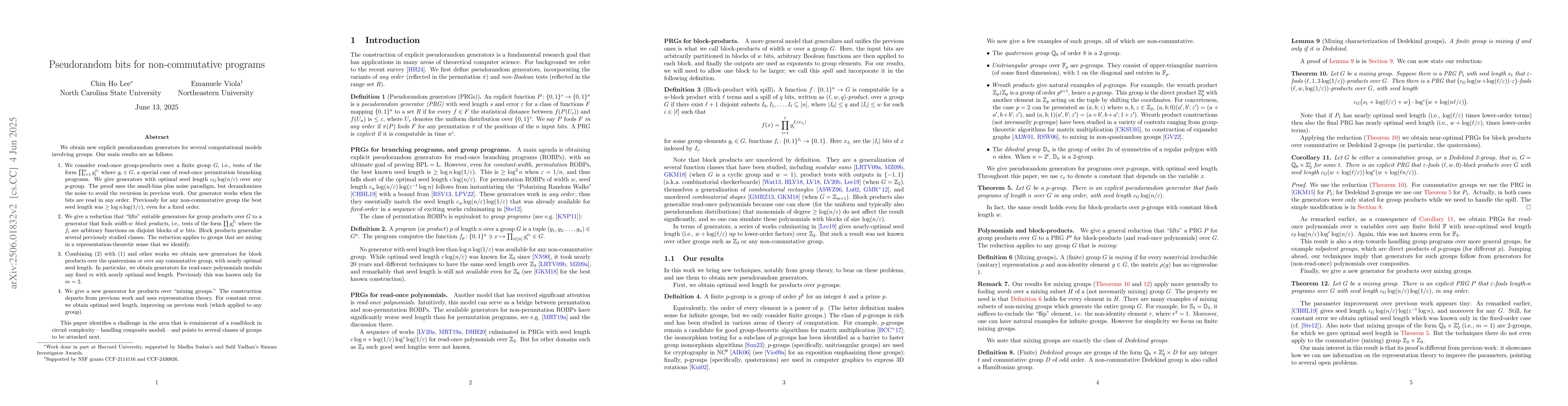 The paper presents novel pseudorandom generators with optimal seed lengths for various non-commutative computational models, employing derandomization techniques and representation theory.