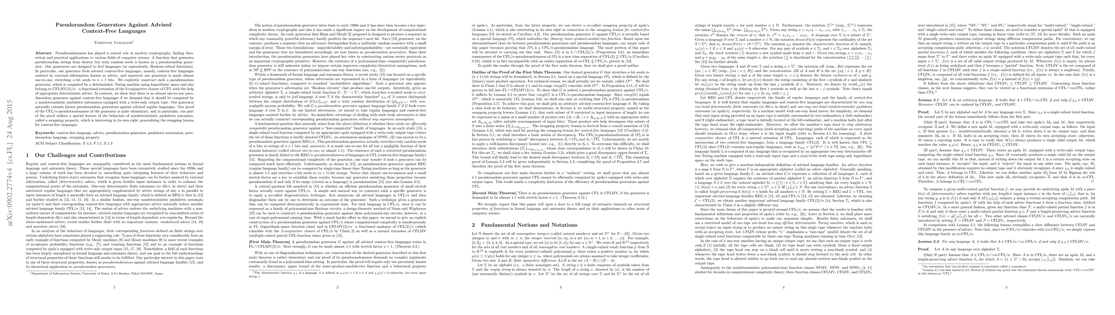 Pseudorandomness has played a central role in modern cryptography, finding theoretical and practical applications to various fields of computer science. A function that generates pseudorandom strings from shorter but truly random seeds is known as a pseudorandom generator. Our generators are designed to fool languages (or equivalently, Boolean-valued functions). In particular, our generator fools advised context-free languages, namely, context-free languages assisted by external information known as advice, and moreover our generator is made almost one-to-one, stretching $n$-bit seeds to $n+1$ bits. We explicitly construct such a pseudorandom generator, which is computed by a deterministic Turing machine using logarithmic space and also belongs to CFLMV(2)/n---a functional extension of the 2-conjunctive closure of CFL with the help of appropriate deterministic advice. In contrast, we show that there is no almost one-to-one pseudorandom generator against context-free languages if we demand that it should be computed by a nondeterministic pushdown automaton equipped with a write-only output tape. Our generator naturally extends known pseudorandom generators against advised regular languages. Our proof of the CFL/n-pseudorandomness of the generator is quite elementary, and in particular, one part of the proof utilizes a special feature of the behaviors of nondeterministic pushdown automata, called a swapping property, which is interesting in its own right, generalizing the swapping lemma for context-free languages.
