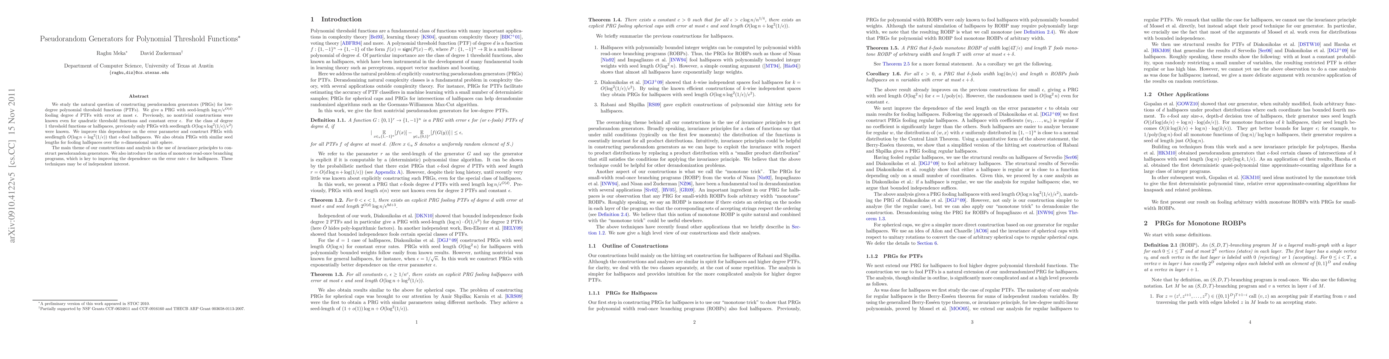 This paper presents improved pseudorandom generators (PRGs) for low-degree polynomial threshold functions (PTFs) using invariance principles and monotone read-once branching programs. It achieves better seed lengths for fooling PTFs and halfspaces, especially with respect to the error parameter eps, potentially benefiting broader applications in theoretical computer science.