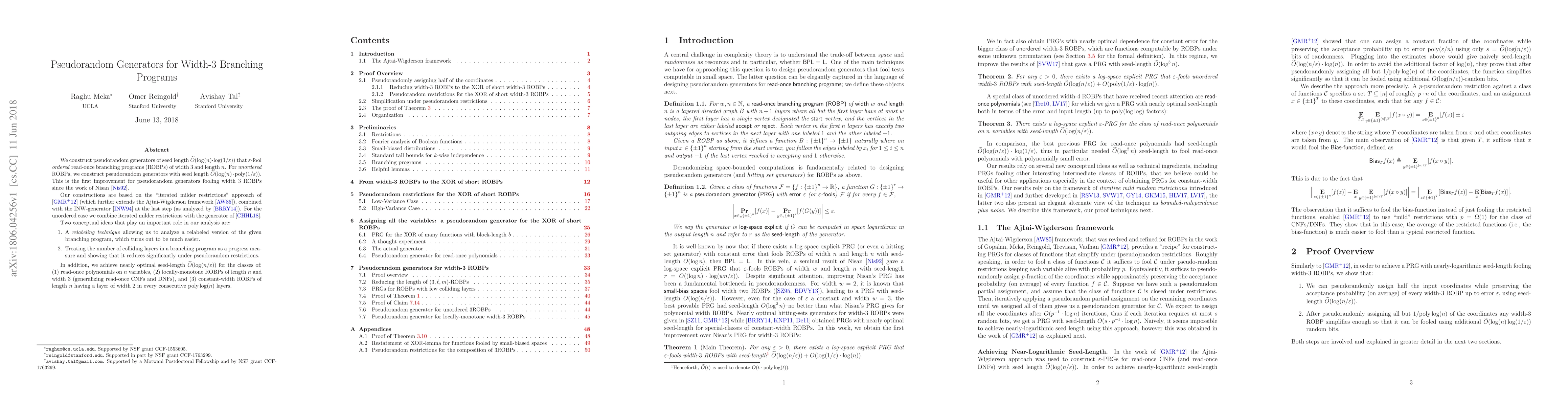 We construct pseudorandom generators of seed length $\tilde{O}(\log(n)\cdot \log(1/\epsilon))$ that $\epsilon$-fool ordered read-once branching programs (ROBPs) of width $3$ and length $n$. For unordered ROBPs, we construct pseudorandom generators with seed length $\tilde{O}(\log(n) \cdot \mathrm{poly}(1/\epsilon))$. This is the first improvement for pseudorandom generators fooling width $3$ ROBPs since the work of Nisan [Combinatorica, 1992]. Our constructions are based on the `iterated milder restrictions' approach of Gopalan et al. [FOCS, 2012] (which further extends the Ajtai-Wigderson framework [FOCS, 1985]), combined with the INW-generator [STOC, 1994] at the last step (as analyzed by Braverman et al. [SICOMP, 2014]). For the unordered case, we combine iterated milder restrictions with the generator of Chattopadhyay et al. [CCC, 2018]. Two conceptual ideas that play an important role in our analysis are: (1) A relabeling technique allowing us to analyze a relabeled version of the given branching program, which turns out to be much easier. (2) Treating the number of colliding layers in a branching program as a progress measure and showing that it reduces significantly under pseudorandom restrictions. In addition, we achieve nearly optimal seed-length $\tilde{O}(\log(n/\epsilon))$ for the classes of: (1) read-once polynomials on $n$ variables, (2) locally-monotone ROBPs of length $n$ and width $3$ (generalizing read-once CNFs and DNFs), and (3) constant-width ROBPs of length $n$ having a layer of width $2$ in every consecutive $\mathrm{poly}\log(n)$ layers.