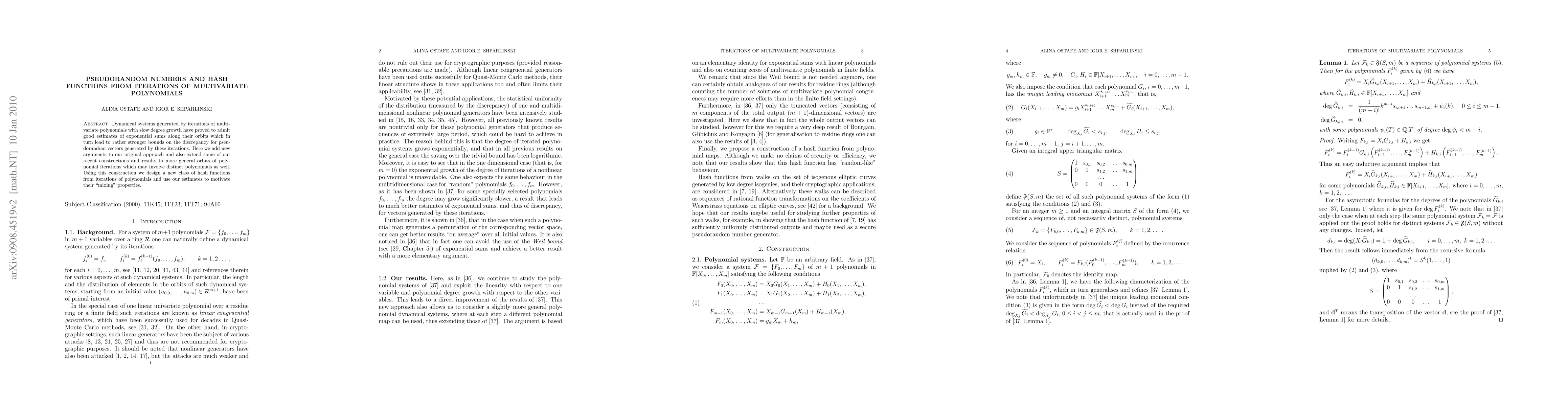 This paper explores the use of dynamical systems generated by iterating multivariate polynomials to construct pseudorandom vectors and hash functions. The authors improve upon previous estimates and extend their approach to more general orbits, demonstrating stronger bounds on the discrepancy and analyzing the "mixing" properties of the resulting hash functions.