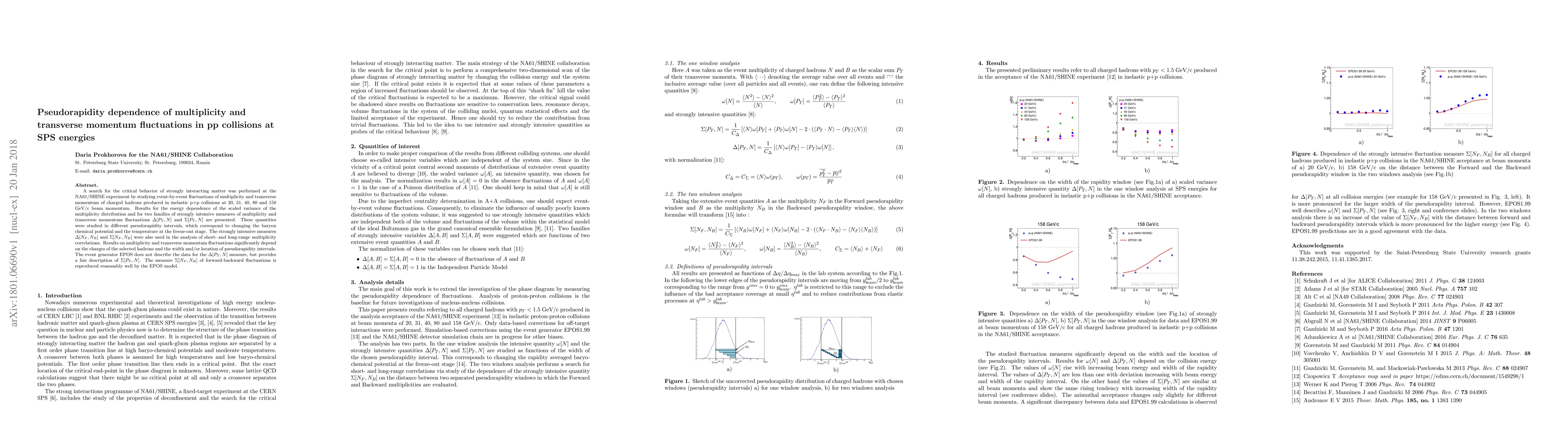 This study investigates critical behavior in strongly interacting matter via fluctuations in multiplicity and transverse momentum in proton-proton collisions at various SPS energies, revealing significant pseudorapidity dependence and discrepancies between experimental data and the EPOS event generator model. The analysis uses scaled variance and intensive measures to explore these fluctuations.