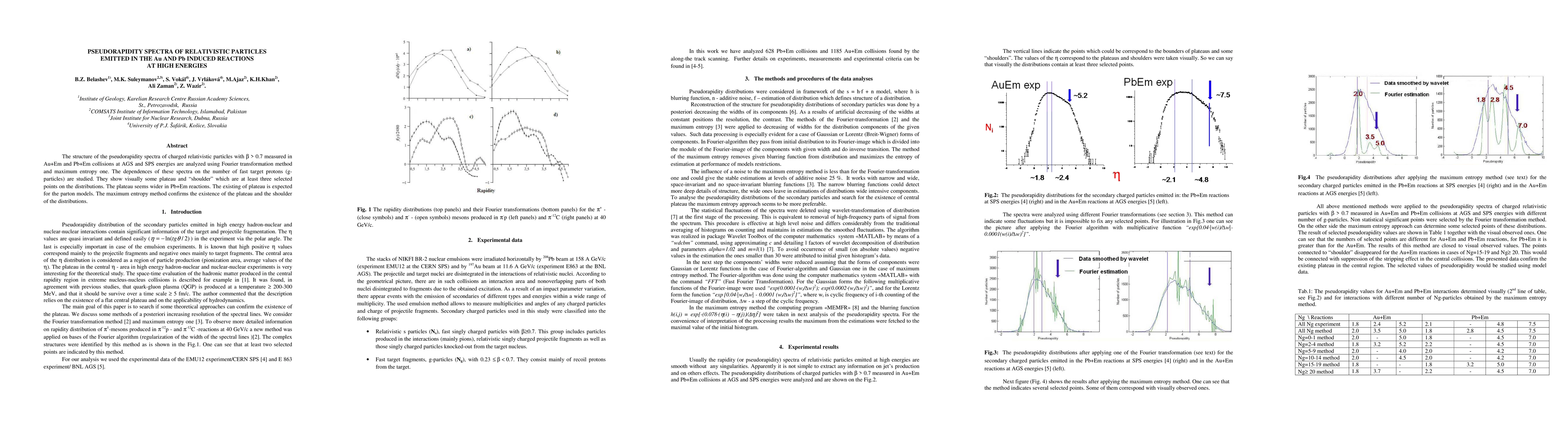 The structure of the pseudorapidity spectra of charged relativistic particles with beta > 0.7 measured in Au+Em and Pb+Em collisions at AGS and SPS energies are analyzed using Fourier transformation method and maximum entropy one. The dependences of these spectra on the number of fast target protons (g-particles) are studied. They show visually some plateau and "shoulder" which are at least three selected points on the distributions. The plateau seems wider in Pb+Em reactions. The existing of plateau is expected for the parton models. The maximum entropy method confirms the existence of the plateau and the shoulder of the distributions.