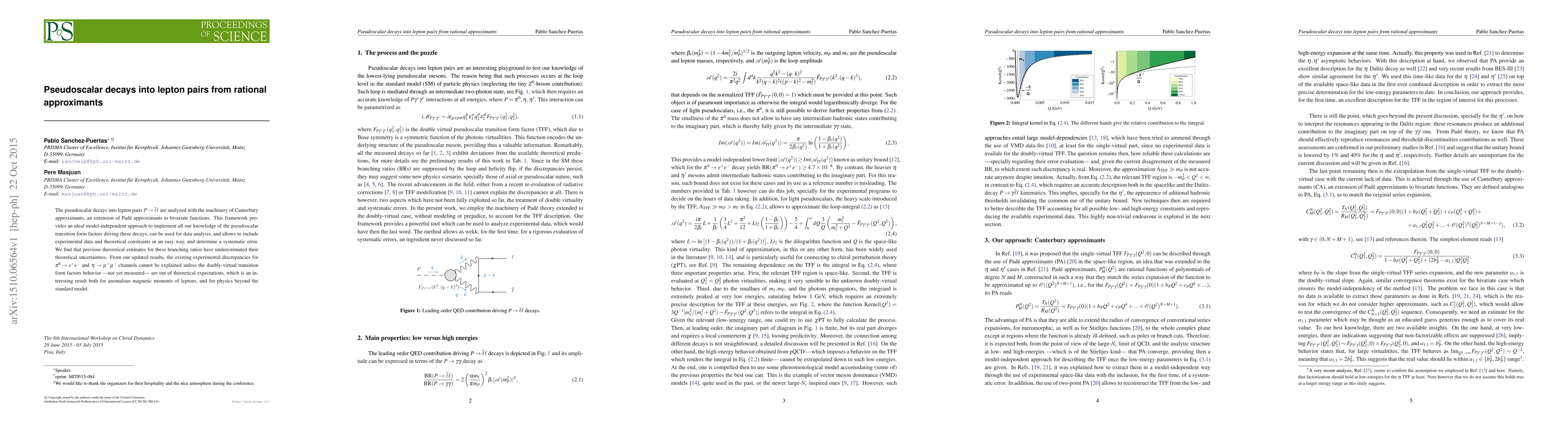 This paper uses Canterbury approximants to analyze pseudoscalar decays into lepton pairs, finding that previous estimates underestimated theoretical uncertainties. The updated results suggest that discrepancies in experimental data may indicate deviations from expected behavior in doubly-virtual transition form factors, hinting at potential physics beyond the standard model.