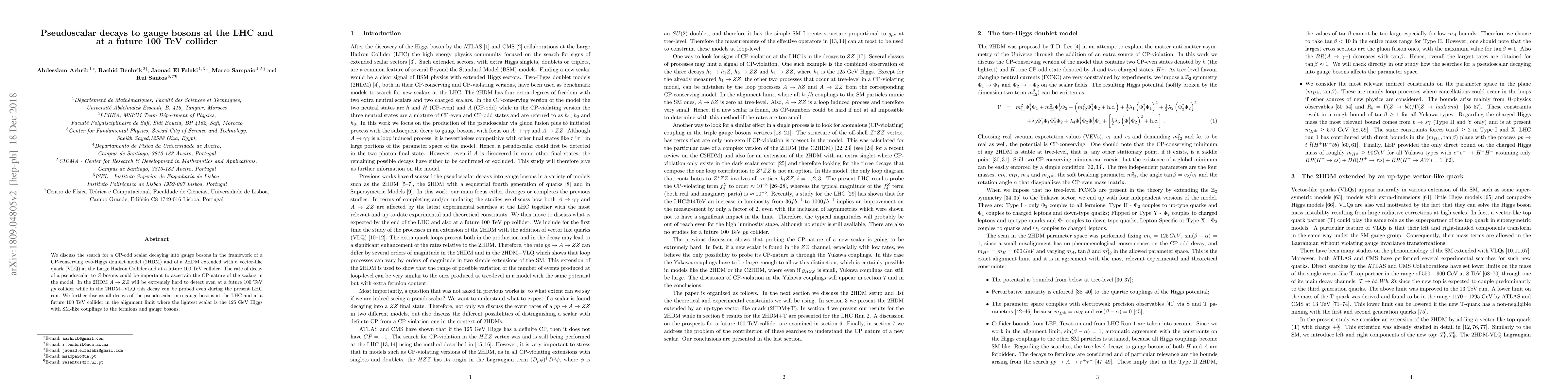 This paper explores the potential detection of CP-odd scalar decays into gauge bosons within a CP-conserving two-Higgs doublet model and its extension with a vector-like quark, focusing on the Large Hadron Collider and a future 100 TeV collider. It highlights that the $A \to ZZ$ decay is challenging to observe even at higher energies, while the 2HDM+VLQ model may allow for detection during the current LHC run.