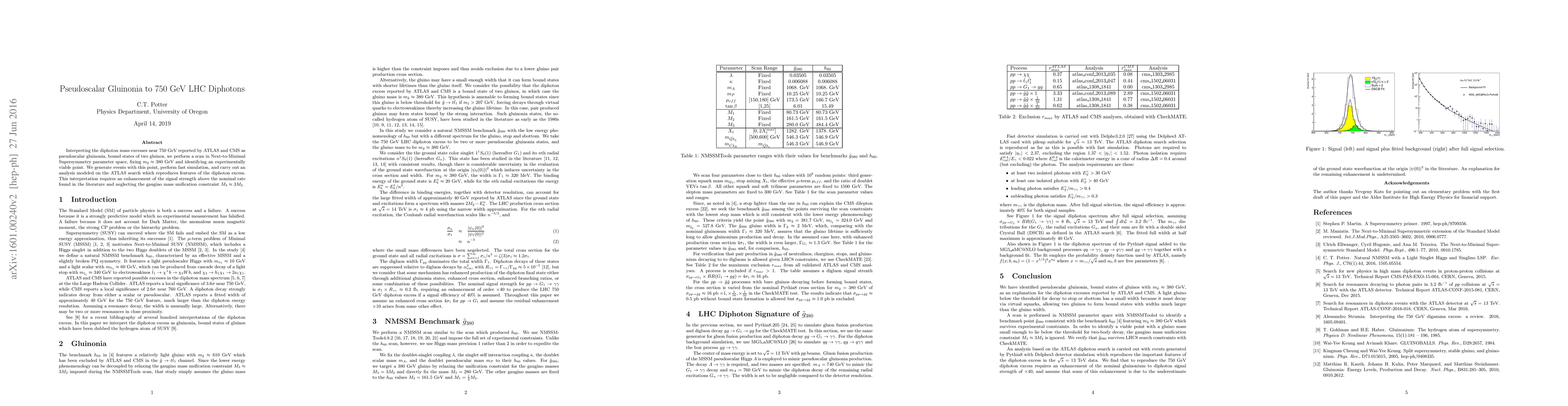 Interpreting the diphoton mass excesses near 750~GeV reported by ATLAS and CMS as pseudoscalar gluinonia, bound states of two gluinos, we perform a scan in Next-to-Minimal Supersymmetry parameter space, fixing $m_{\tilde{g}}\approx 380$~GeV and identifying an experimentally viable point. We generate events with this point, perform fast simulation, and carry out an analysis modeled on the ATLAS search which reproduces features of the diphoton excess. This interpretation requires an enhancement of the signal strength above the nominal rate found in the literature and neglecting the gaugino mass unification constraint $M_{3}\approx 3M_{2}$.