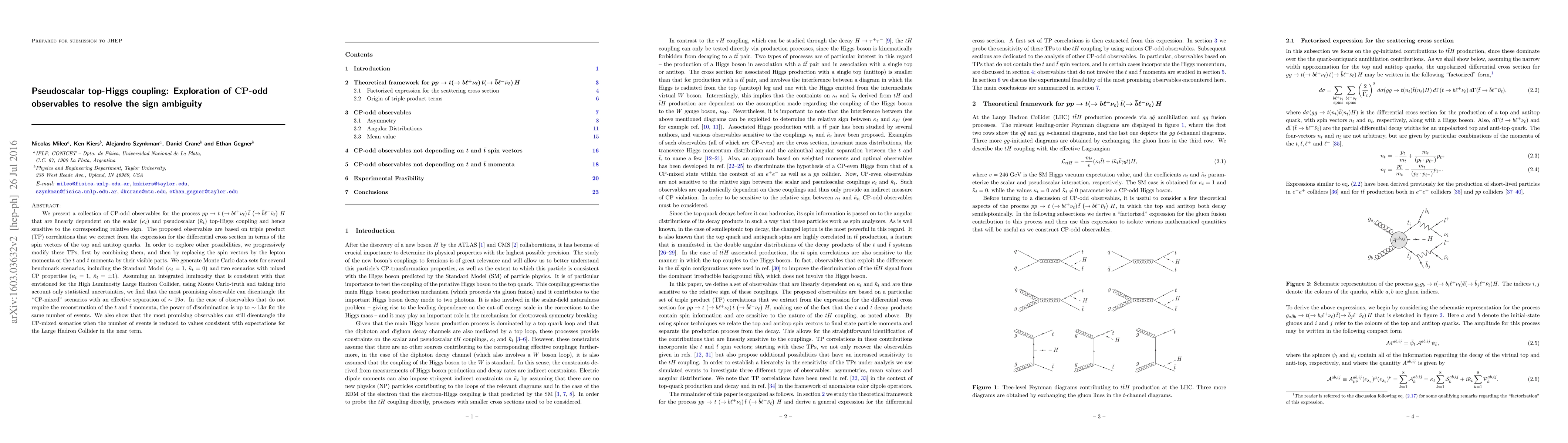 We present a collection of $\mathrm{CP}$-odd observables for the process $pp\to t\,\left(\rightarrow b {\ell}^+ \nu_{\ell}\right) \bar{t}\,\left(\rightarrow \bar{b} {\ell}^-{\bar{\nu}}_{\ell}\right)\,H$ that are linearly dependent on the scalar ($\kappa_t$) and pseudoscalar ($\tilde{\kappa}_t$) top-Higgs coupling and hence sensitive to the corresponding relative sign. The proposed observables are based on triple product (TP) correlations that we extract from the expression for the differential cross section in terms of the spin vectors of the top and antitop quarks. In order to explore other possibilities, we progressively modify these TPs, first by combining them, and then by replacing the spin vectors by the lepton momenta or the $t$ and $\bar{t}$ momenta by their visible parts. We generate Monte Carlo data sets for several benchmark scenarios, including the Standard Model ($\kappa_t=1$, $\tilde{\kappa}_t=0$) and two scenarios with mixed $\mathrm{CP}$ properties ($\kappa_t=1$, $\tilde{\kappa}_t=\pm 1$). Assuming an integrated luminosity that is consistent with that envisioned for the High Luminosity Large Hadron Collider, using Monte Carlo-truth and taking into account only statistical uncertainties, we find that the most promising observable can disentangle the "$\mathrm{CP}$-mixed" scenarios with an effective separation of $\sim 19\sigma$. In the case of observables that do not require the reconstruction of the $t$ and $\bar{t}$ momenta, the power of discrimination is up to $\sim 13\sigma$ for the same number of events. We also show that the most promising observables can still disentangle the $\mathrm{CP}$-mixed scenarios when the number of events is reduced to values consistent with expectations for the Large Hadron Collider in the near term.
