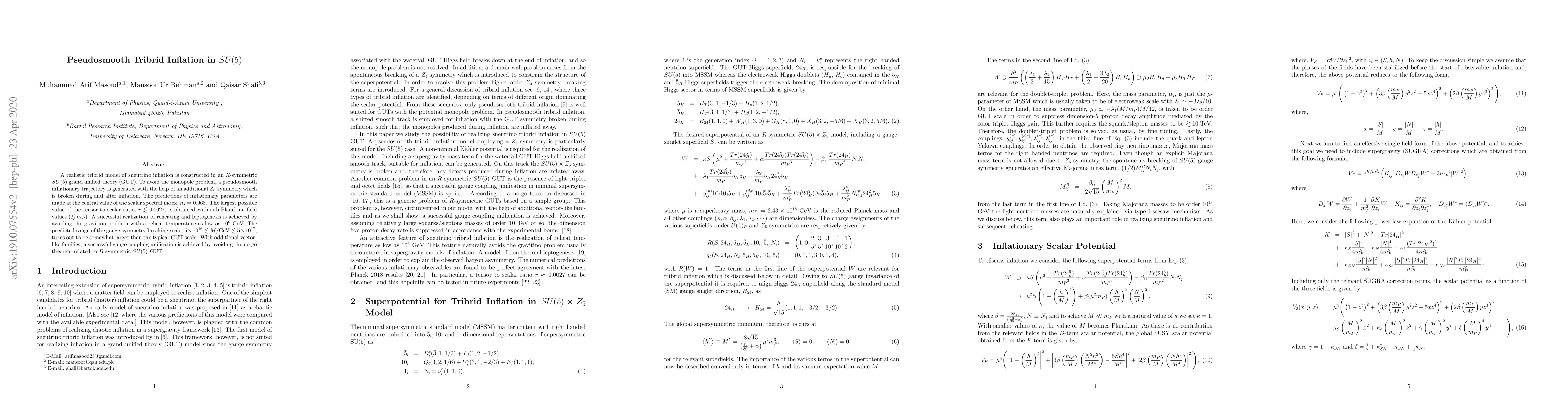 This paper constructs a tribrid sneutrino inflation model in $R$-symmetric $SU(5)$ GUT, utilizing a pseudosmooth inflationary trajectory and a broken $Z_5$ symmetry to avoid the monopole problem. Predictions include a scalar spectral index $n_s = 0.968$ and a tensor-to-scalar ratio $r \lesssim 0.0027$.